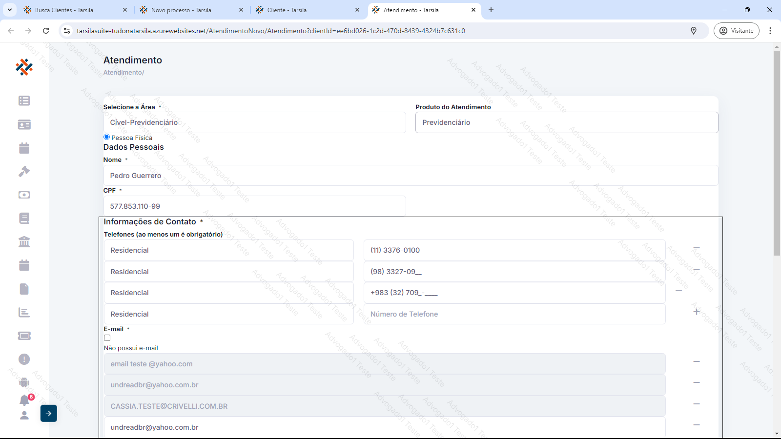 A ficha de atendimento Cível/Previdenciário possui blocos de preenchimento: Dados pessoais, Informações de Contato, Informações Complementares e Resultado do Atendimento.