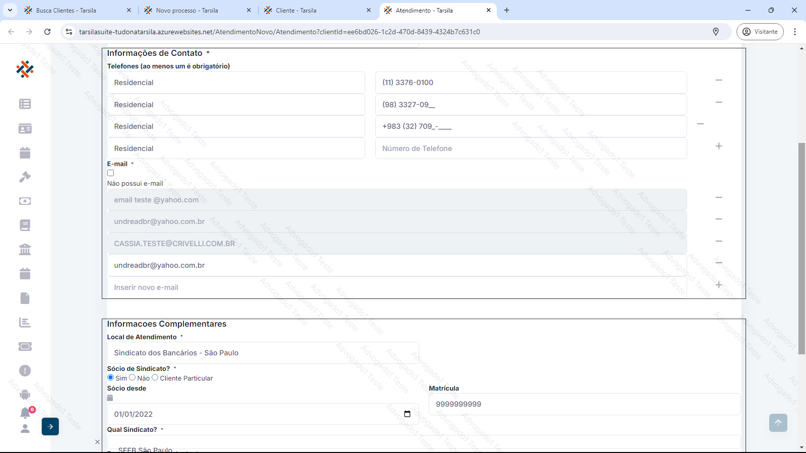 A seguir seleciona-se se o cliente é sócio do sindicato. Em caso positivo são requeridas as informações do sindicato. Em condições específicas, se o cliente desejar, pode-se abrir o caso como Particular, sujeito a participações maiores da Crivelli. Mesmo no caso do cliente não ser sócio de um sindicato, deve-se selecionar um sindicato para alocação do processo. No campo “Descrição do Atendimento” é obrigatório se descrever um resumo do atendimento realizado.