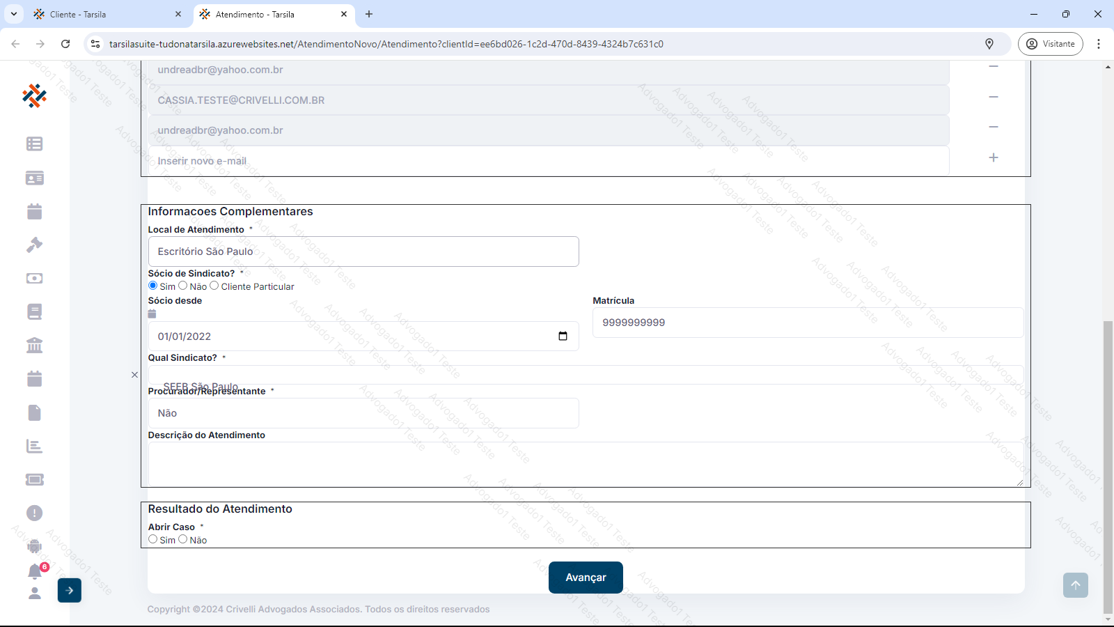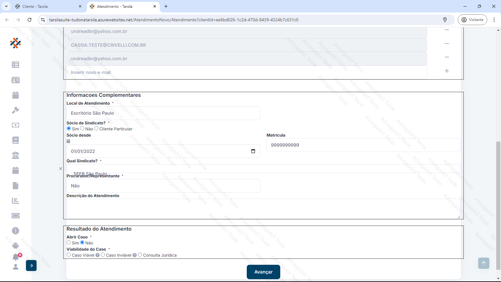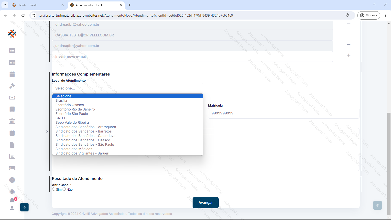 Em “Resultado do Atendimento” deve-se definir se será aberto o caso e, caso contrário, a viabilidade do mesmo. Normalmente neste ponto, segue-se com a abertura de caso, porém se houver algum impeditivo e selecionado a opção “Não”, há a seleção de viabilidade da situação ou se o propósito do atendimento foi uma apenas uma consulta jurídica. Nesta situação, clicar em “Avançar” encerra o atendimento.