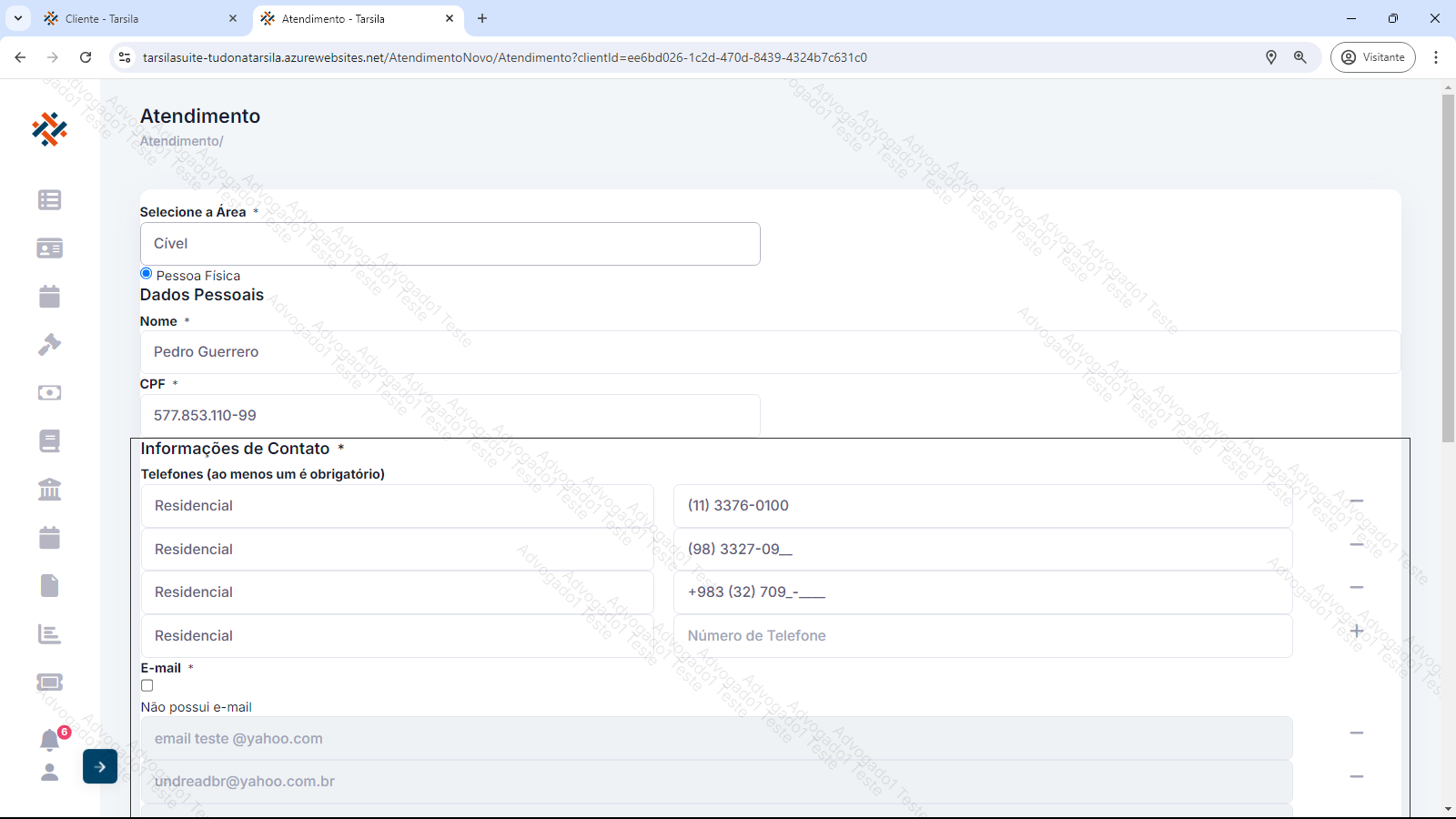 A ficha de atendimento Cível possui blocos de preenchimento: Dados pessoais, Informações de Contato, Informações Complementares e Resultado do Atendimento.