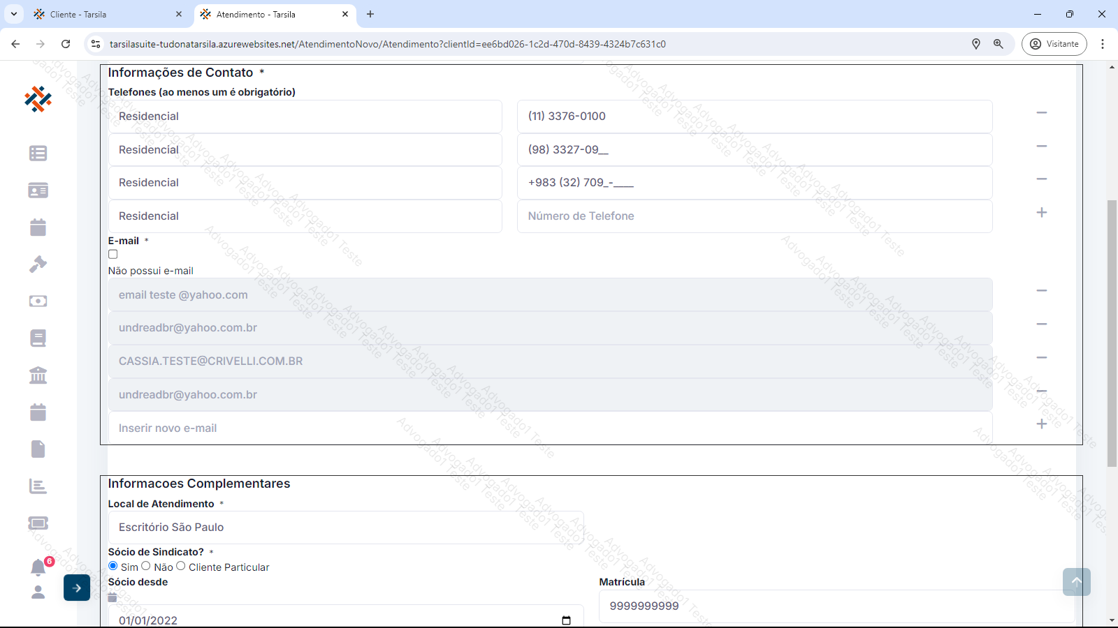 A seguir seleciona-se se o cliente é sócio do sindicato. Em caso positivo são requeridas as informações do sindicato. Em condições específicas, se o cliente desejar, pode-se abrir o caso como Particular, sujeito a participações maiores da Crivelli. Mesmo no caso do cliente não ser sócio de um sindicato, deve-se selecionar um sindicato para alocação do processo. No campo “Descrição do Atendimento” é obrigatório se descrever um resumo do atendimento realizado.