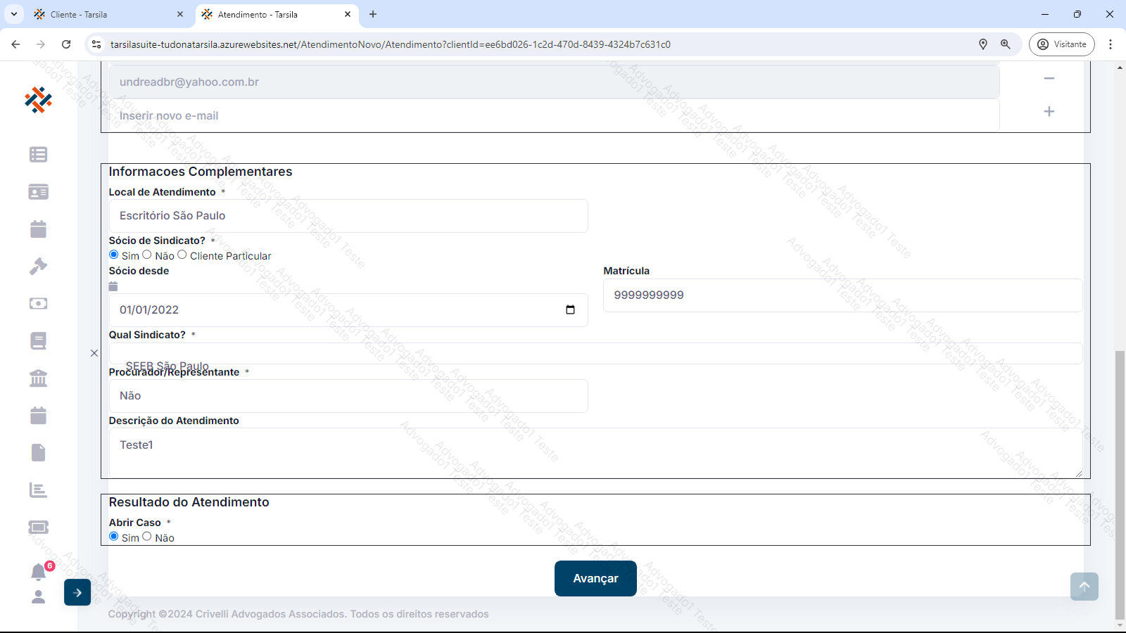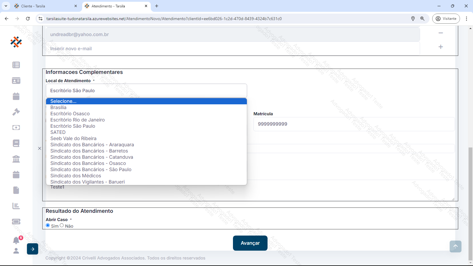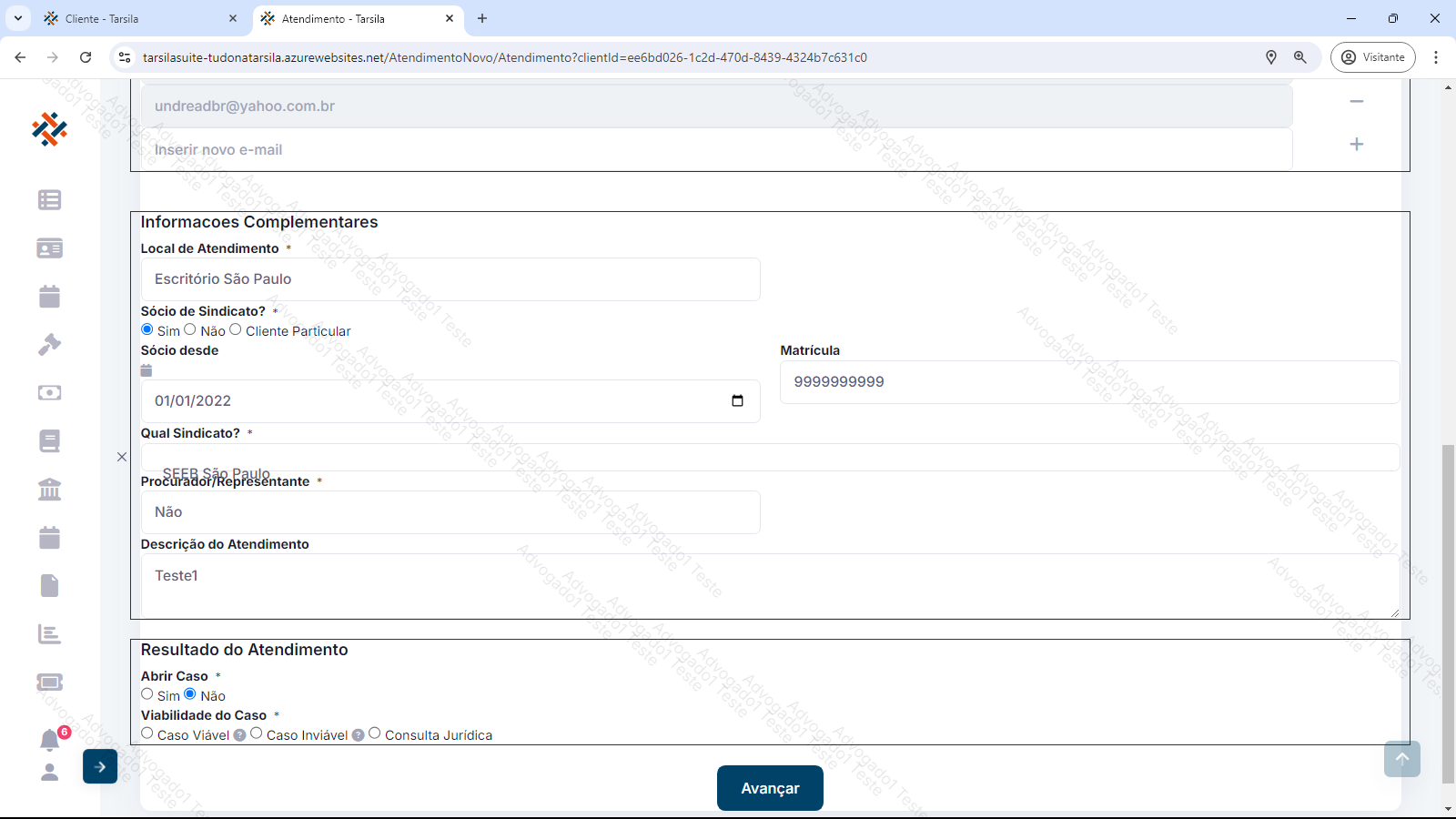 Em “Resultado do Atendimento” deve-se definir se será aberto o caso e, caso contrário, a viabilidade do mesmo. Normalmente neste ponto, segue-se com a abertura de caso, porém se houver algum impeditivo e selecionado a opção “Não”, há a seleção de viabilidade da situação ou se o propósito do atendimento foi uma apenas uma consulta jurídica. Nesta situação, clicar em “Avançar” encerra o atendimento.