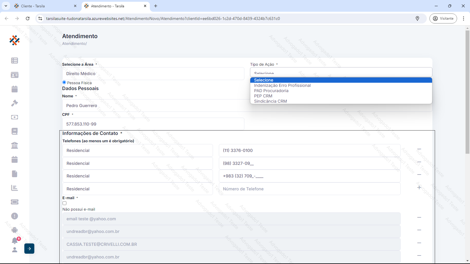 Na modalidade de Direito Médico, deve-se selecionar o tipo de ação conforme a situação do cliente.