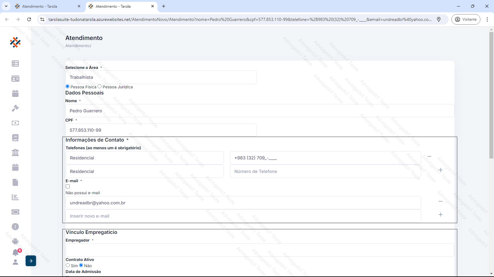 A ficha de atendimento Trabalhista possui blocos de preenchimento: Dados pessoais, Informações de Contato, Vínculo Empregatício, Informações Complementares e Resultado do Atendimento.