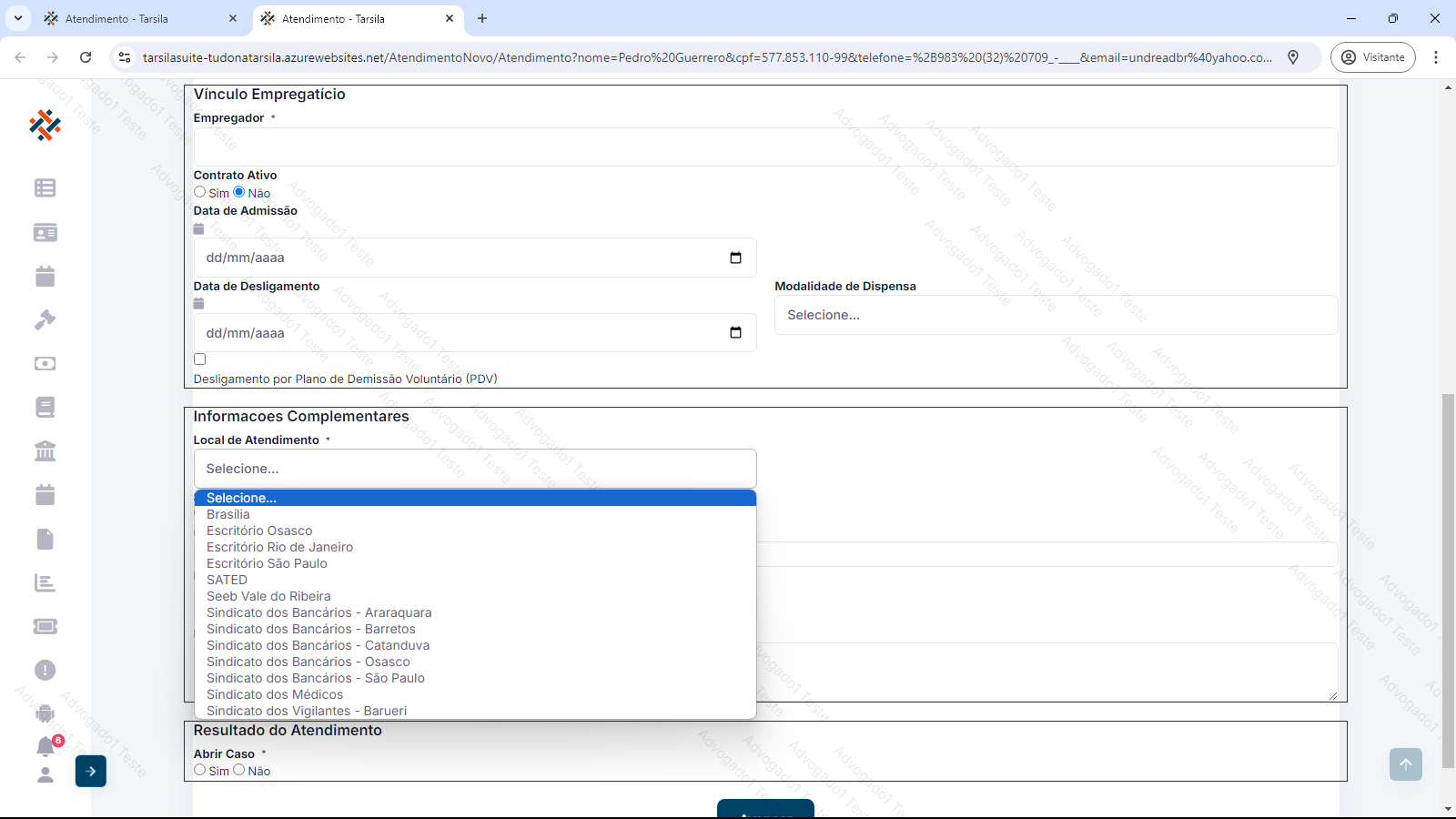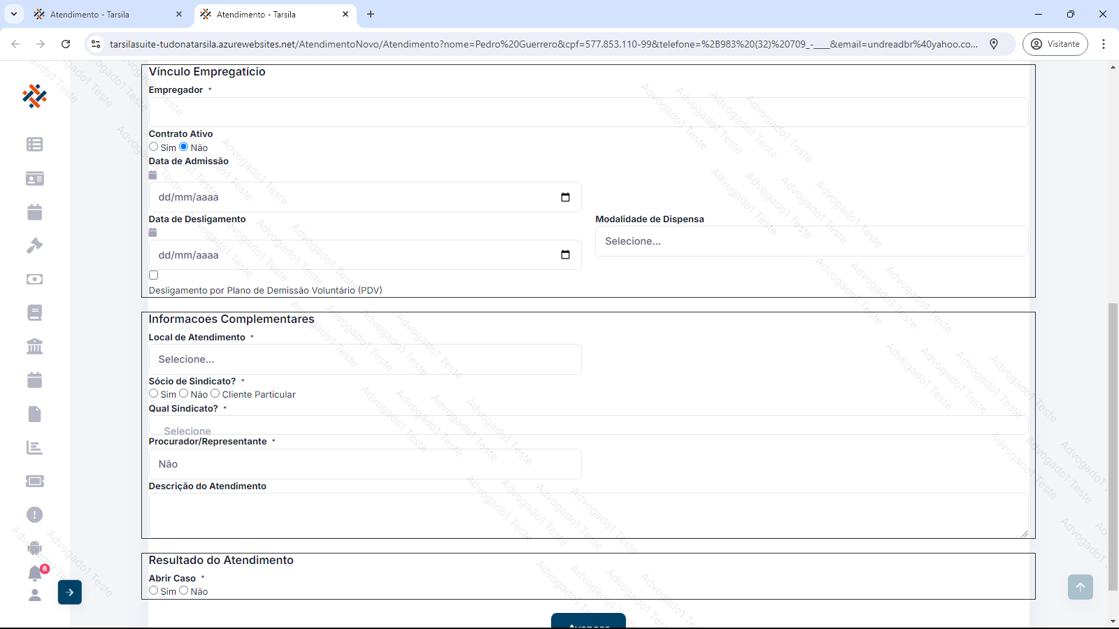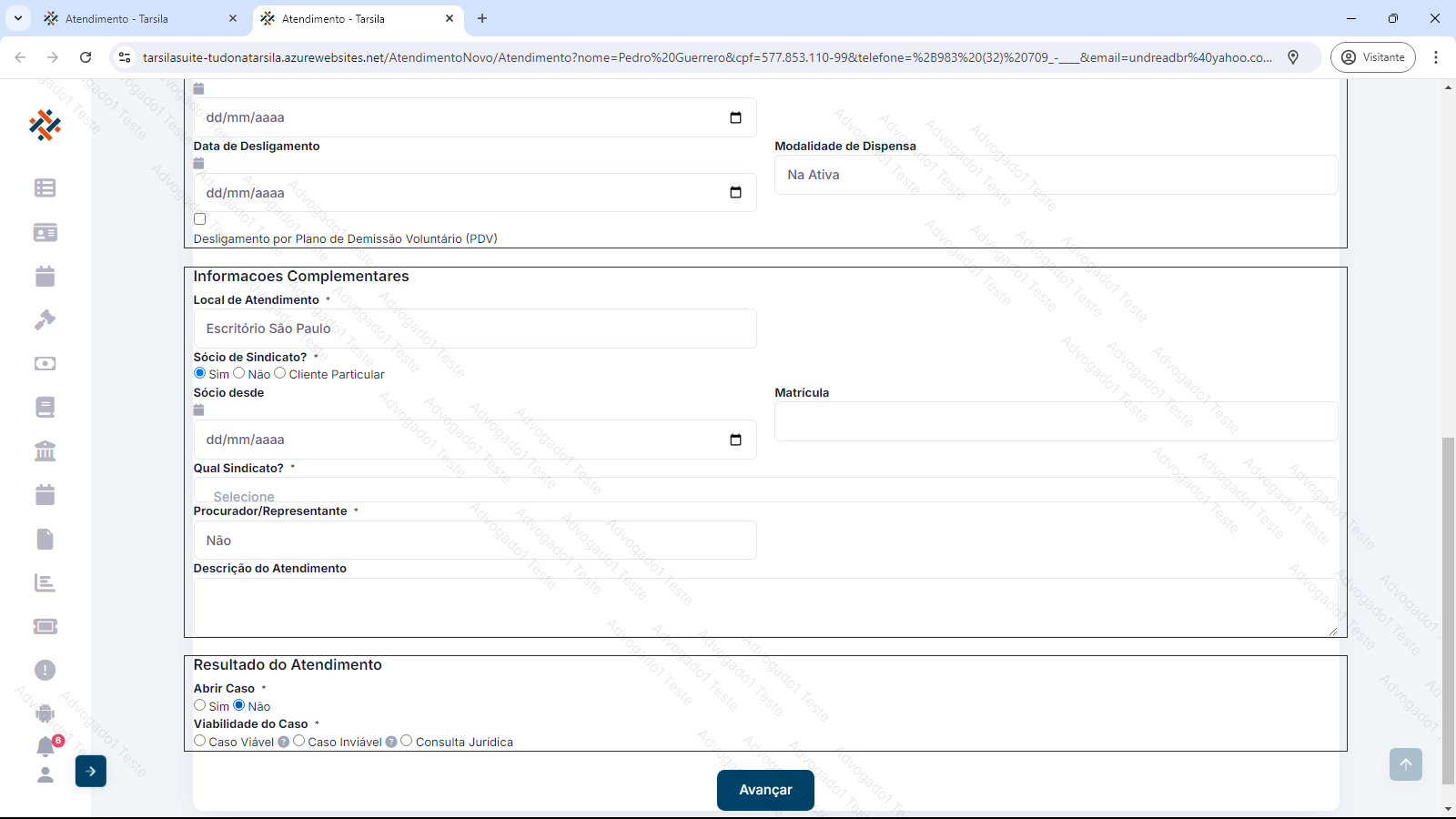 Em “Resultado do Atendimento” deve-se definir se será aberto o caso e, caso contrário, a viabilidade do mesmo. Normalmente neste ponto, segue-se com a abertura de caso, porém se houver algum impeditivo e selecionado a opção “Não”, há a seleção de viabilidade da situação ou se o propósito do atendimento foi uma apenas uma consulta jurídica. Nesta situação, clicar em “Avançar” encerra o atendimento.