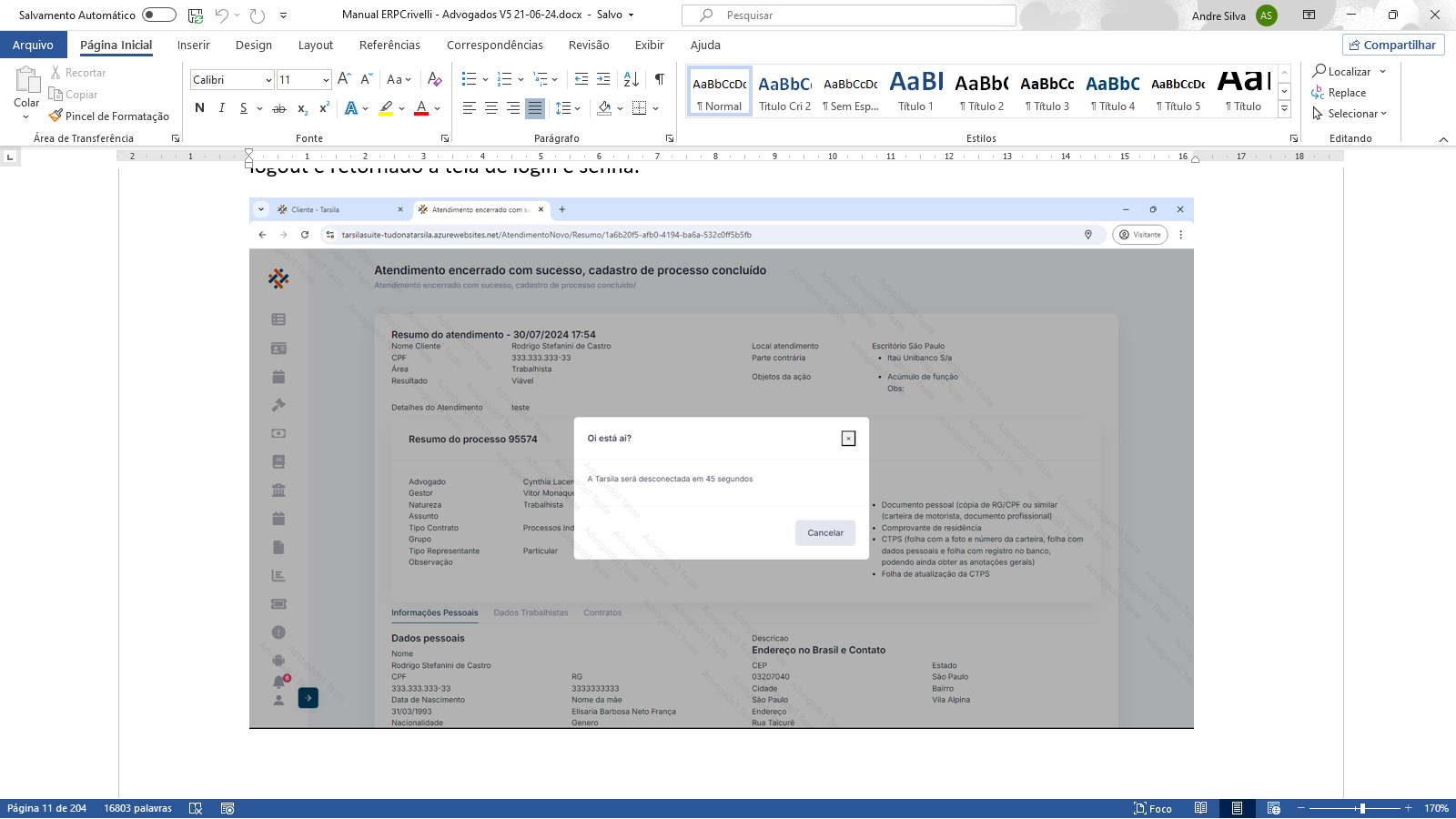 A Tarsila possui uma proteção para a situação do usuário esquecer o sistema aberto. Após 5 minutos de inatividade, será exibida uma mensagem de confirmação da presença do usuário, que caso positivo, pode ser fechada e continuar a operação normalmente. Se o usuário não estiver presente, será efetuado logout e retornado a tela de login e senha.