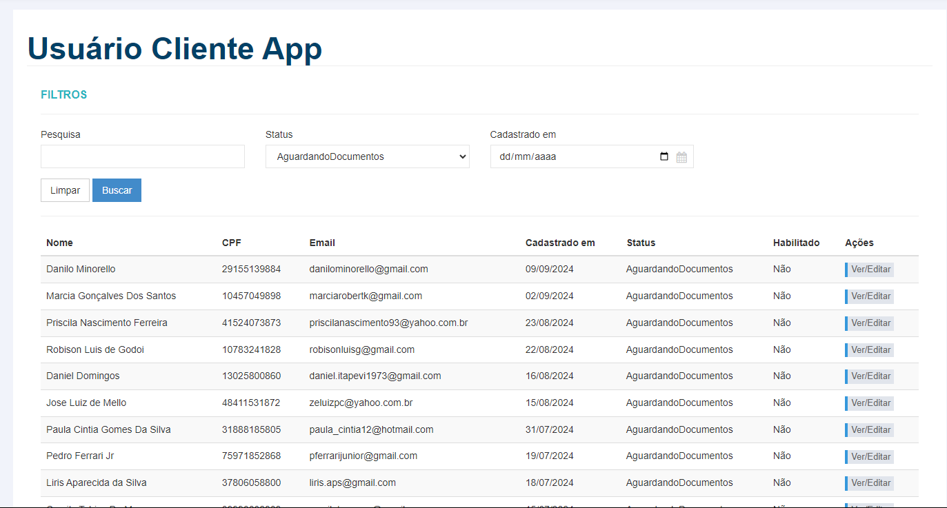 Permite pesquisar quais clientes estão cadastrados no App para acompanhamento do caso.