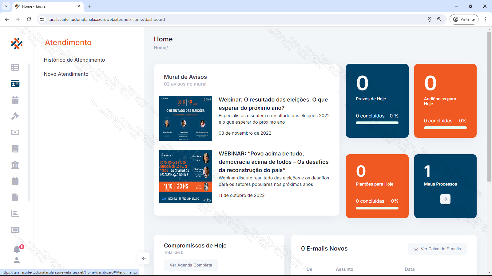 Na Tarsila há a opção de Histórico de atendimentos, para se consultar atendimentos anteriores, ou Novo Atendimento para abertura de novos atendimentos.