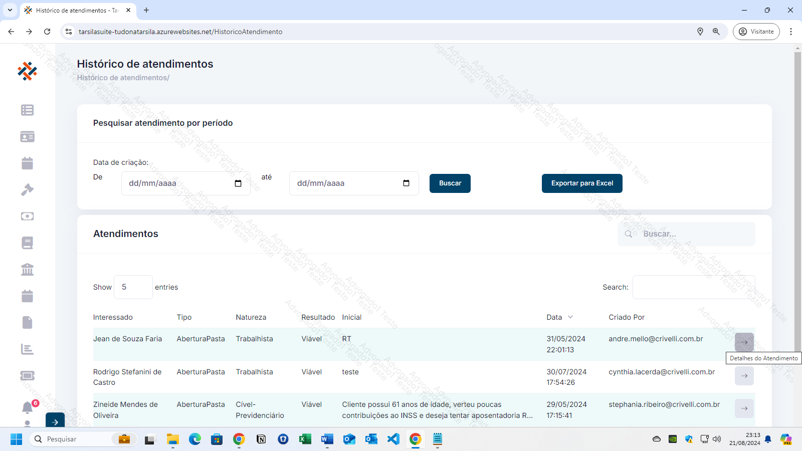 Clicando-se na segunda opção “Histórico de atendimento”, visualiza-se todos os atendimentos realizados.