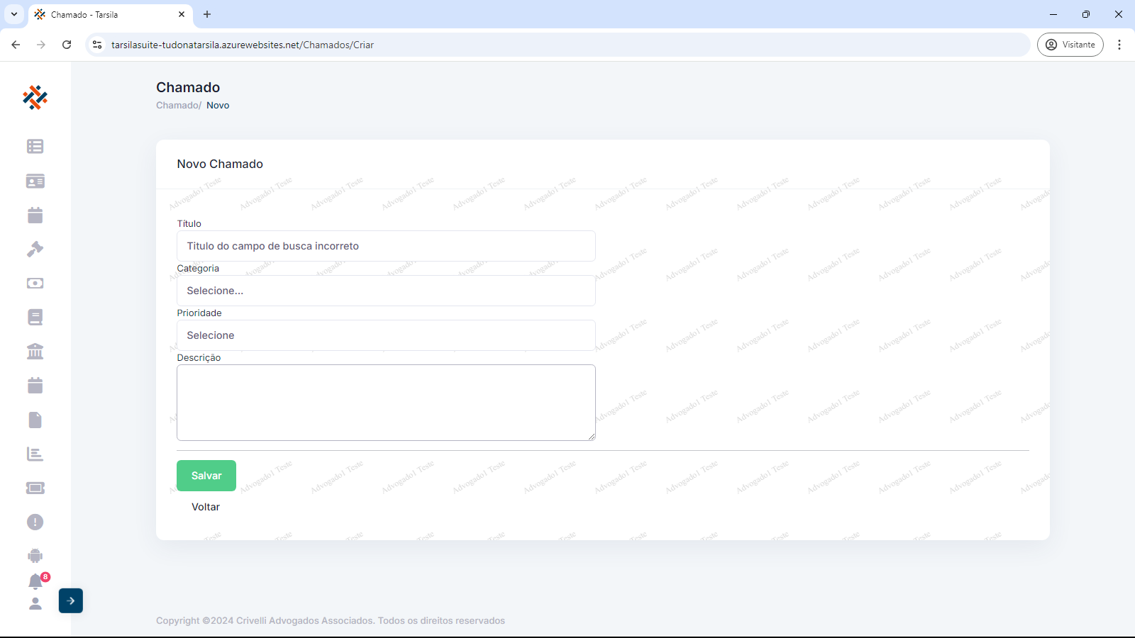 O Botão de “Criar” é utilizado para registrar um novo chamado no sistema, fornecendo as informações de título, categoria, prioridade e descrição detalhada. Se necessário há a opção de se incluir arquivos, como telas de print para demonstrarem as ocorrências.