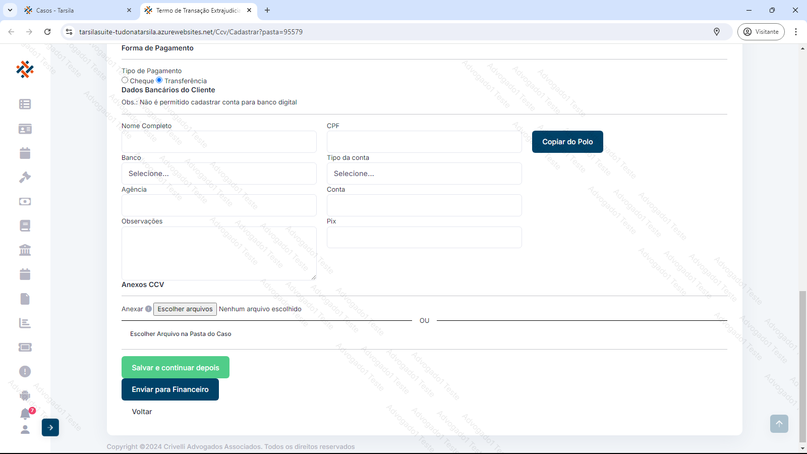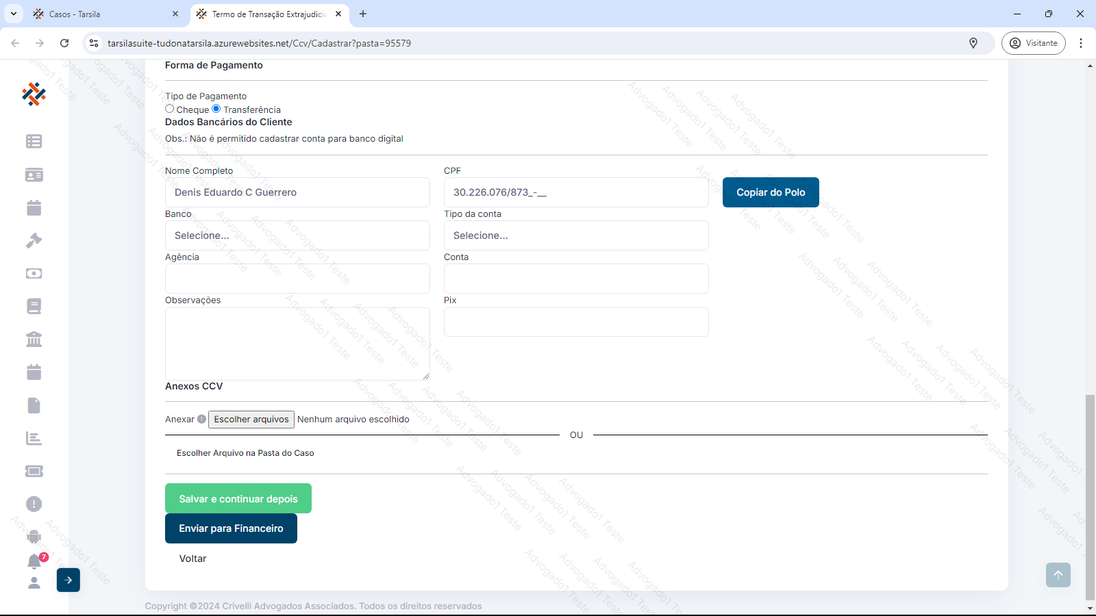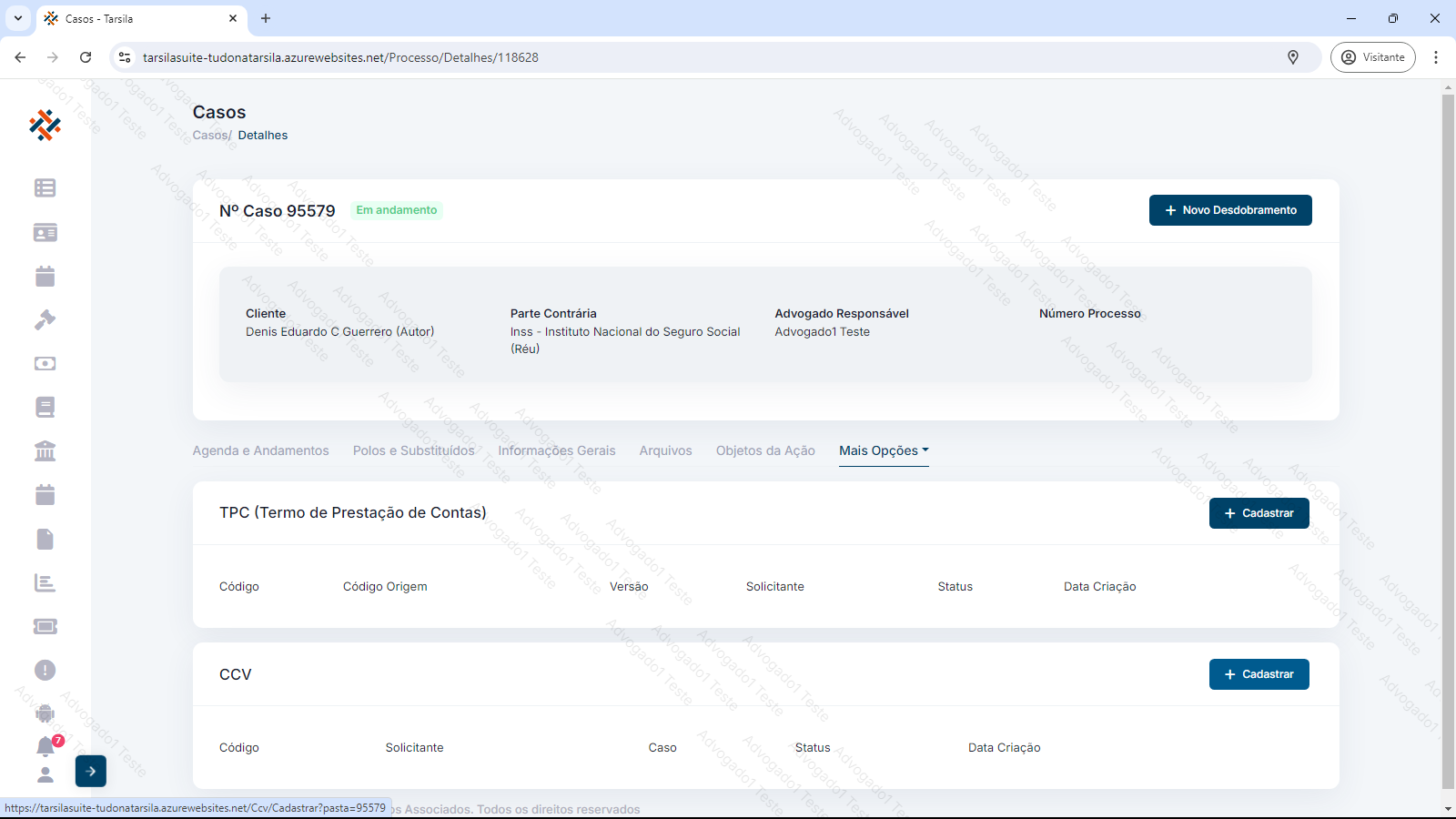 O cadastro de novos termos pode ser realizado acessando o próprio caso, na aba mais opções, TPC/CCV, ou no próprio menu Financeiro. Em qualquer uma das opções, clique no botão “+Cadastrar”.