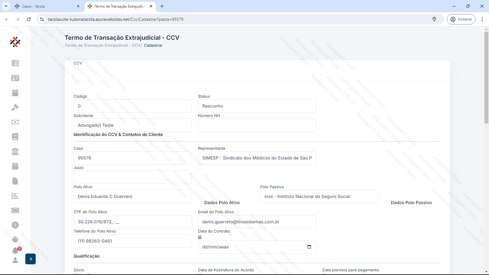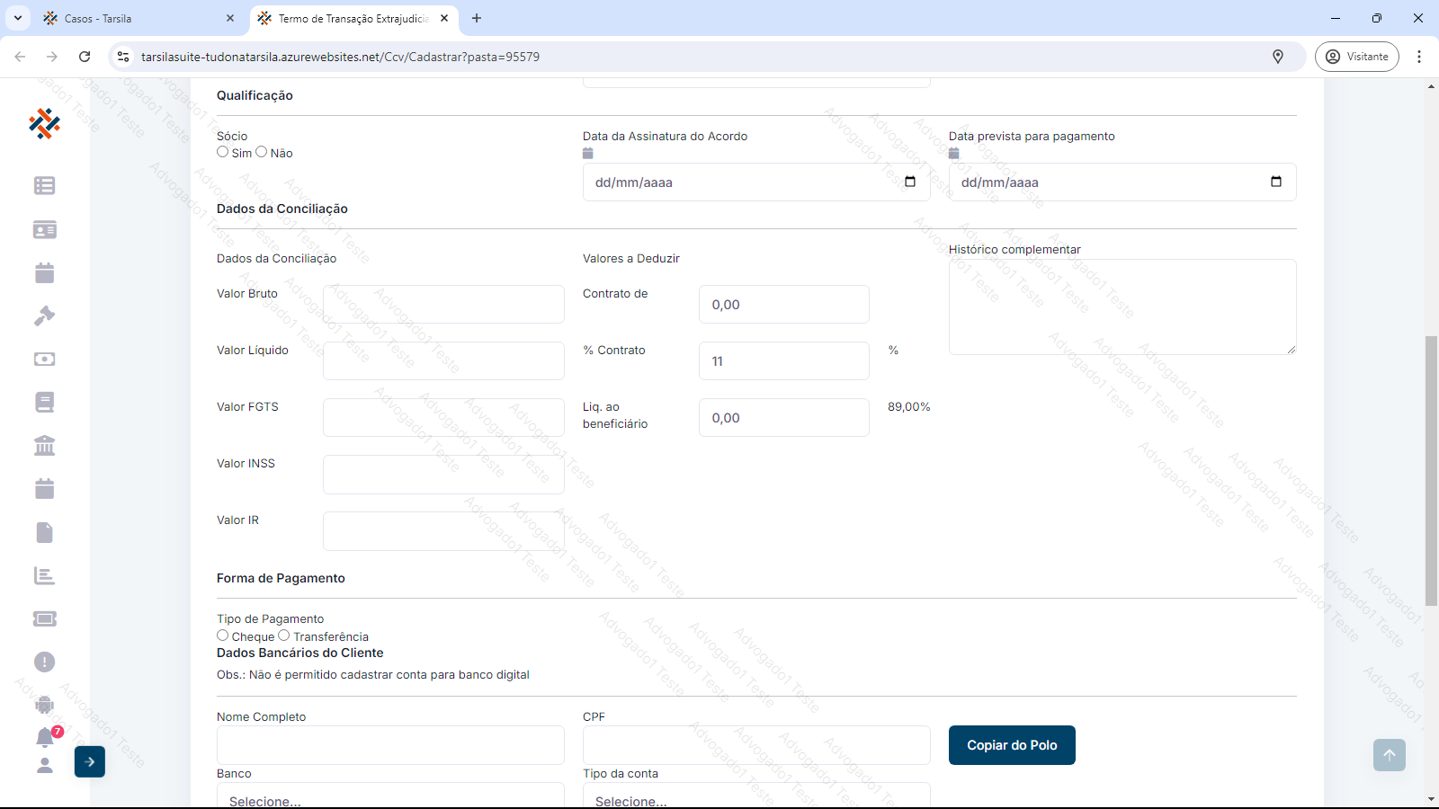 Qualificação: Informar se o cliente é sócio (S/N), a Data da Assinatura do Acordo (data) e a Data prevista para pagamento (data).
