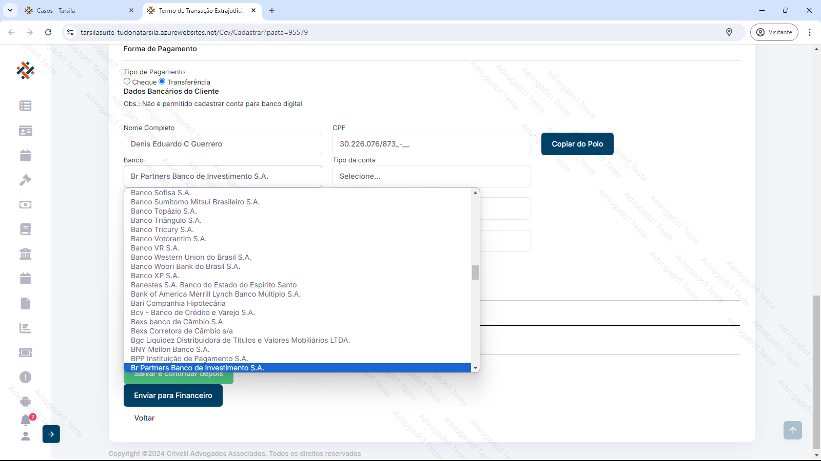 No bloco a seguir, em “Dados Bancários do Cliente”, pode-se importar os dados de Nome e CPF/CNPJ para agilizar o preenchimento, clicando-se em “Copiar do polo”.
