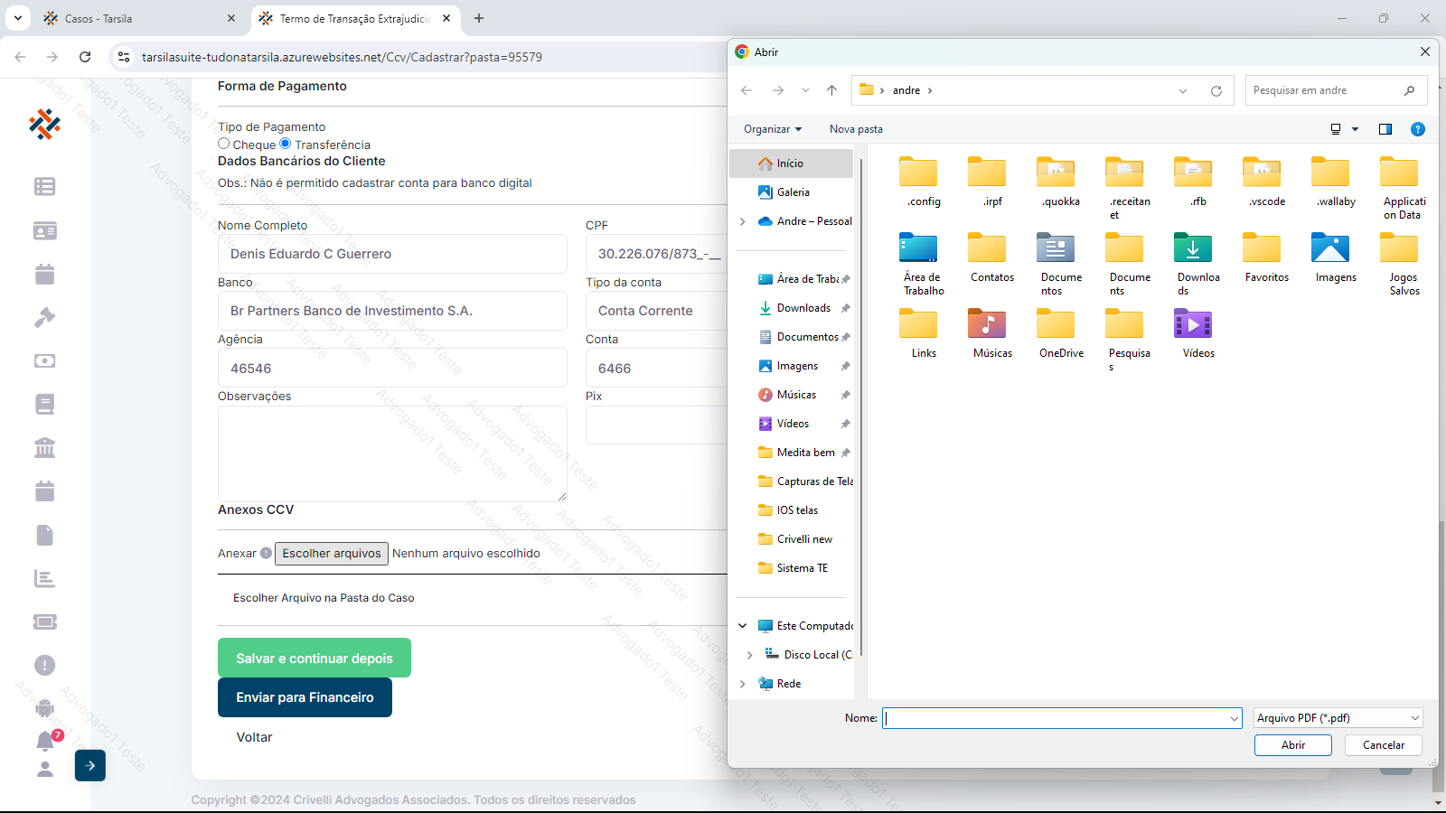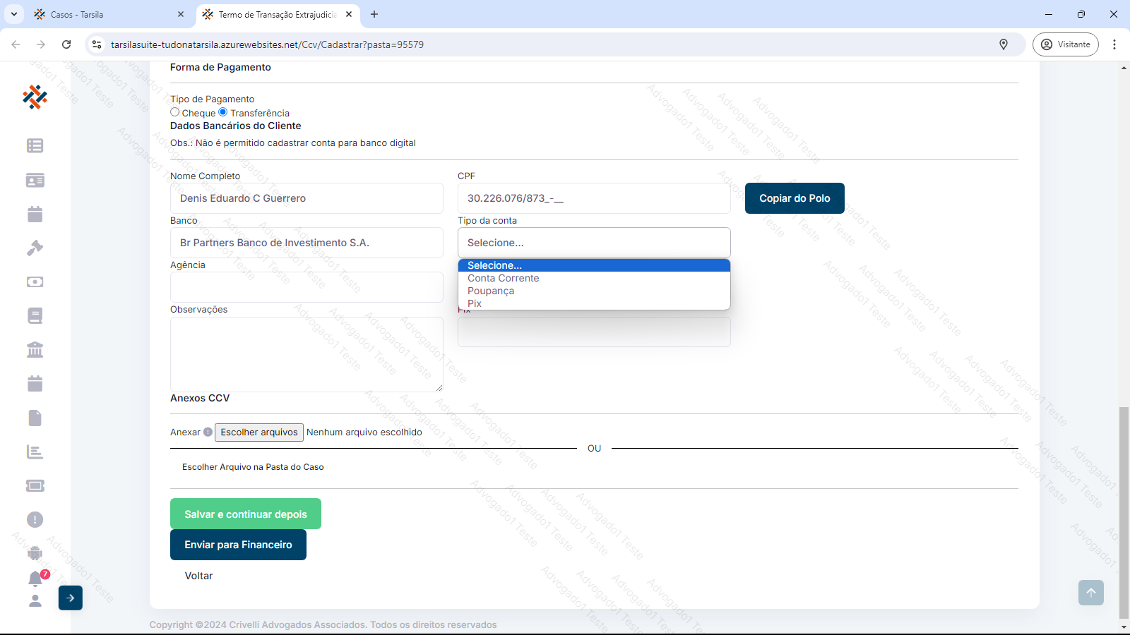 No final as opções para gravação são “Salvar e continuar depois” ou “Enviar para o financeiro”, sendo este último para continuidade do processo.