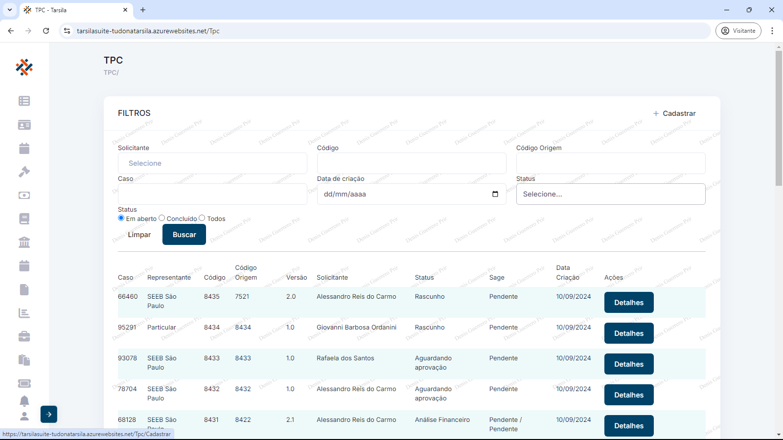 Na tela inicial de TPC, clique “+Cadastrar” para criar um novo TPC.
