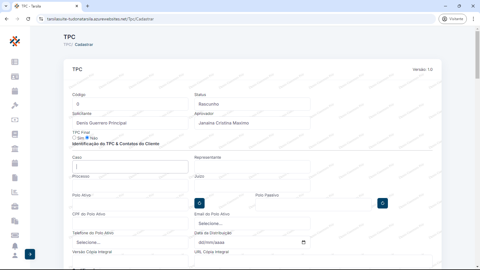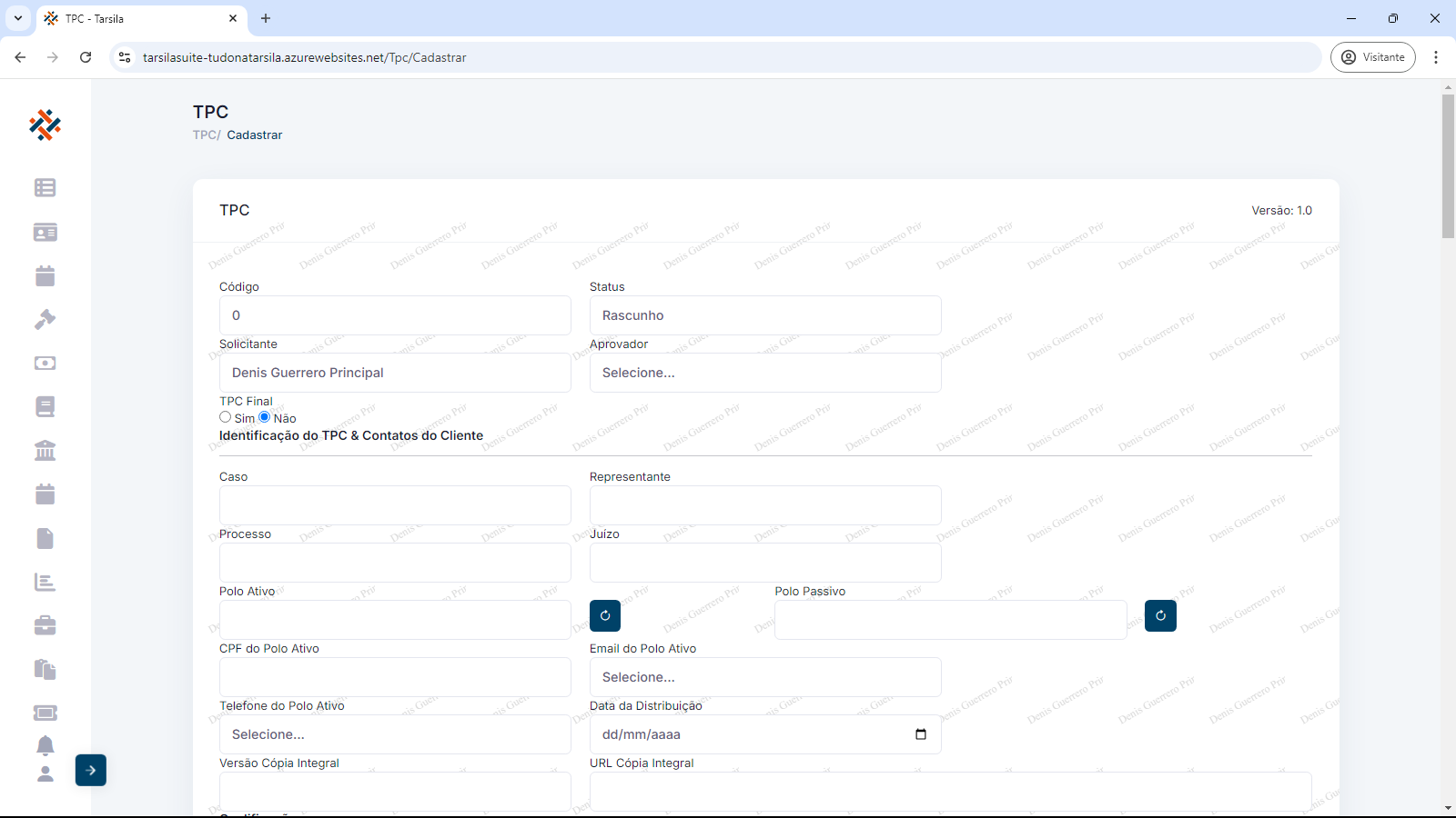 Será exibida a tela para a entrada das informações de cadastro, com a versão inicial (1.0) do TPC.