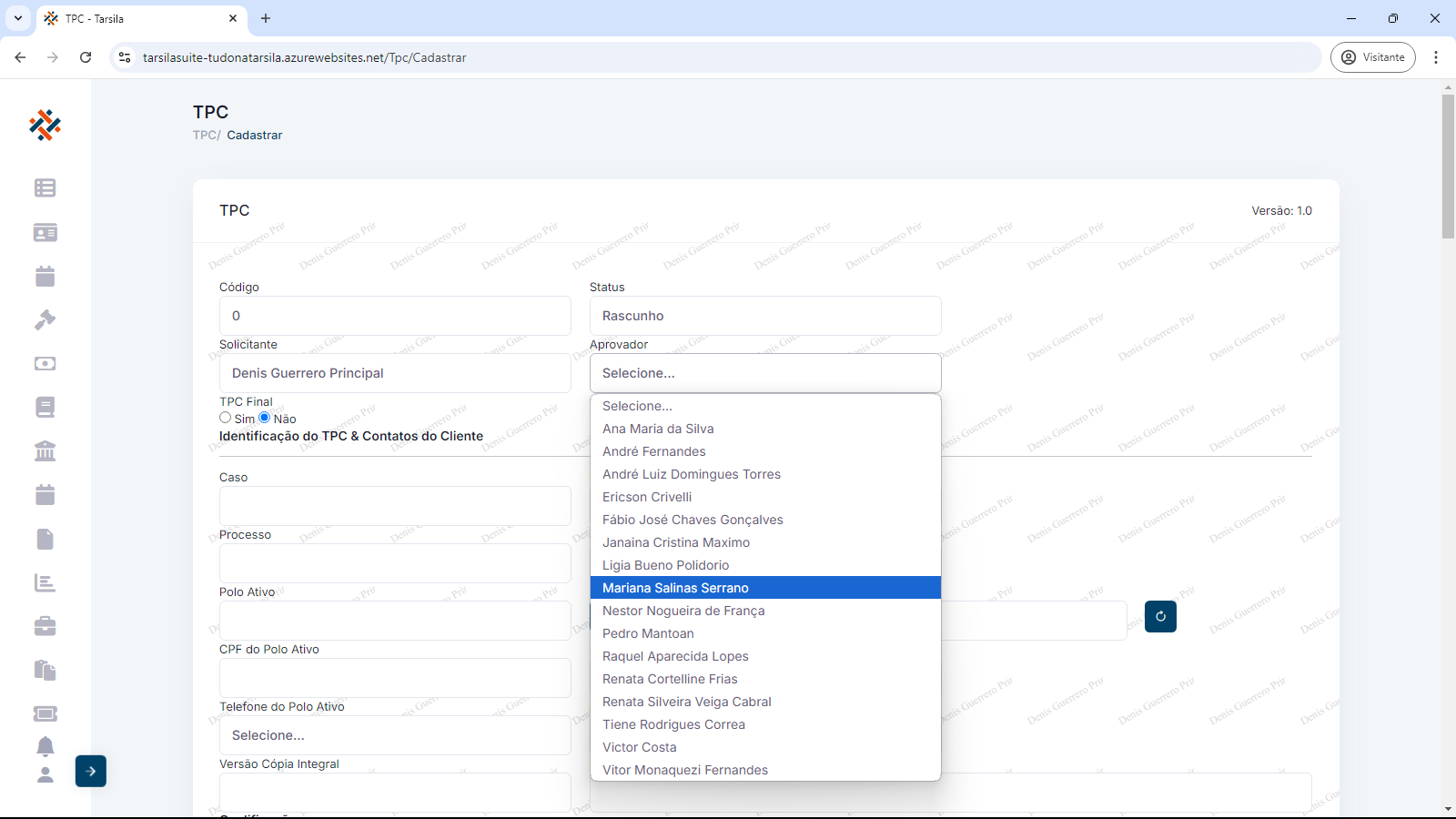 A primeira ação necessária é selecionar o aprovador do TPC que será aberto. Clicando no nome na lista em “Aprovador”, seleciona-se o responsável pela ação.