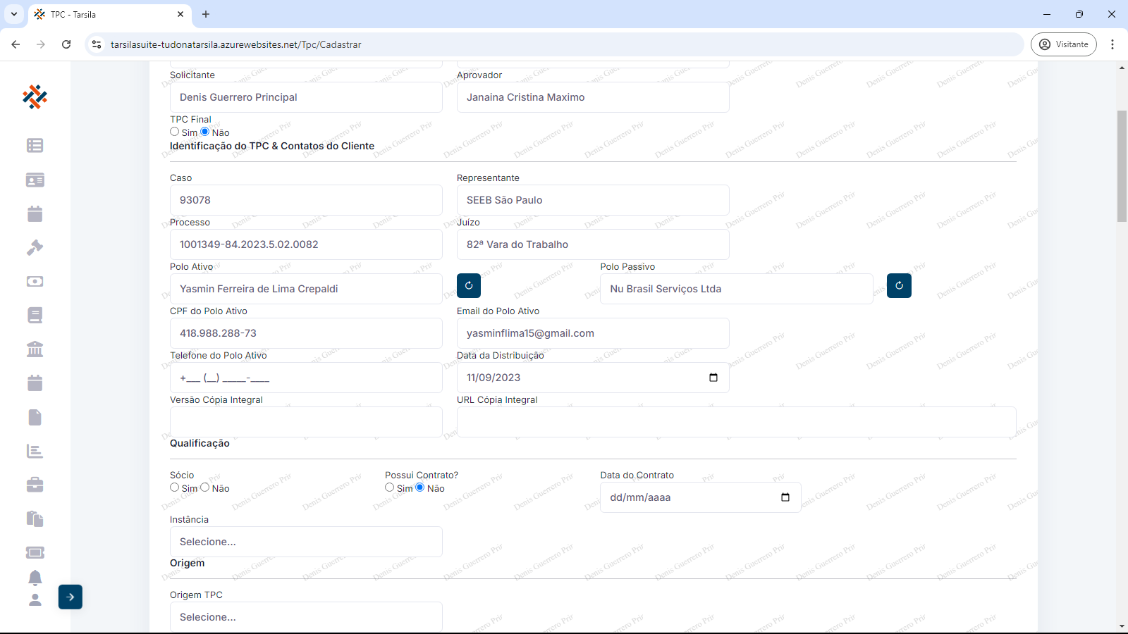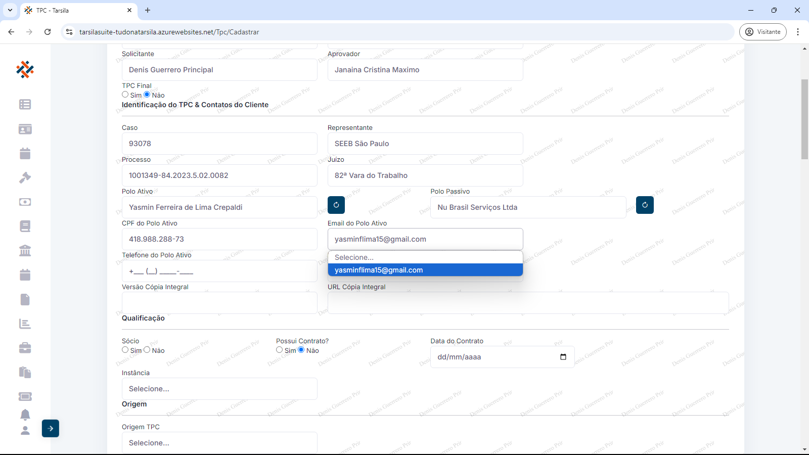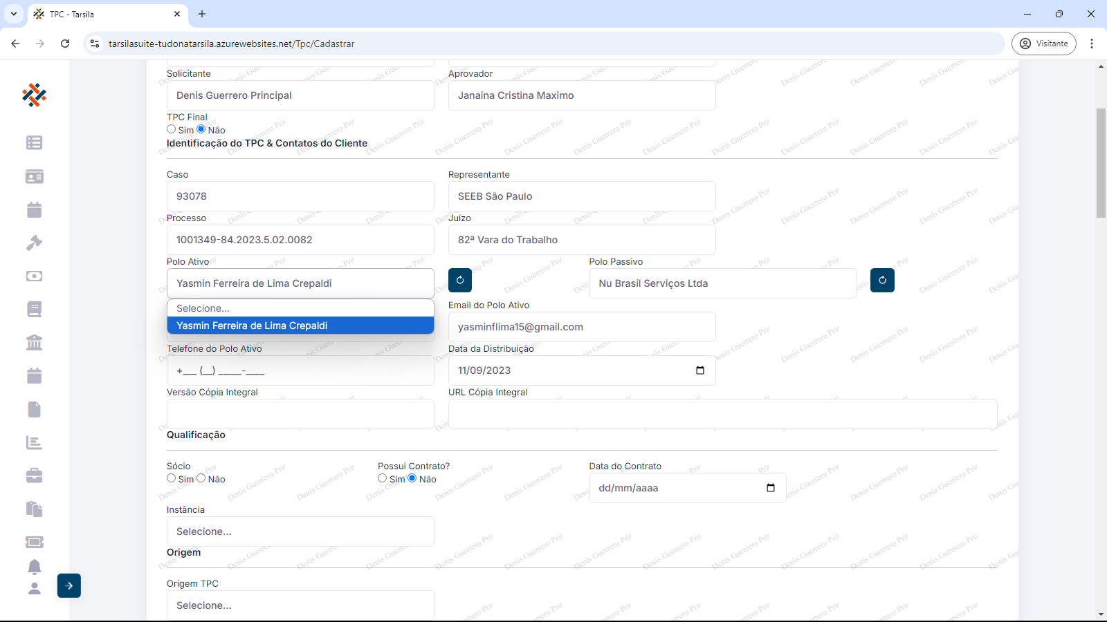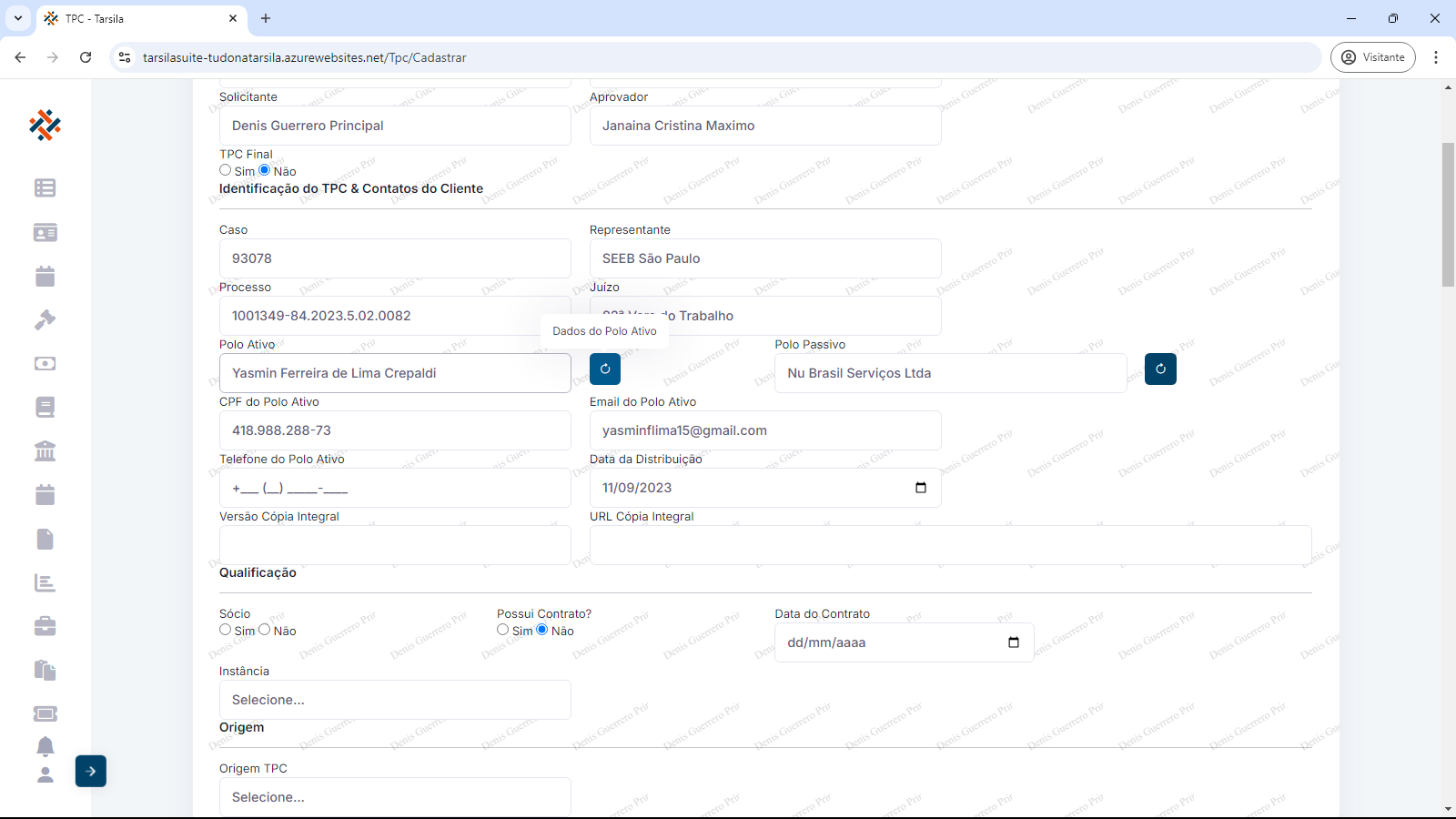 Ao pressionar a tecla ‘TAB” ou clicar no próximo campo (Ex: “Polo Ativo”), as informações subsequentes são preenchidas de forma automática.