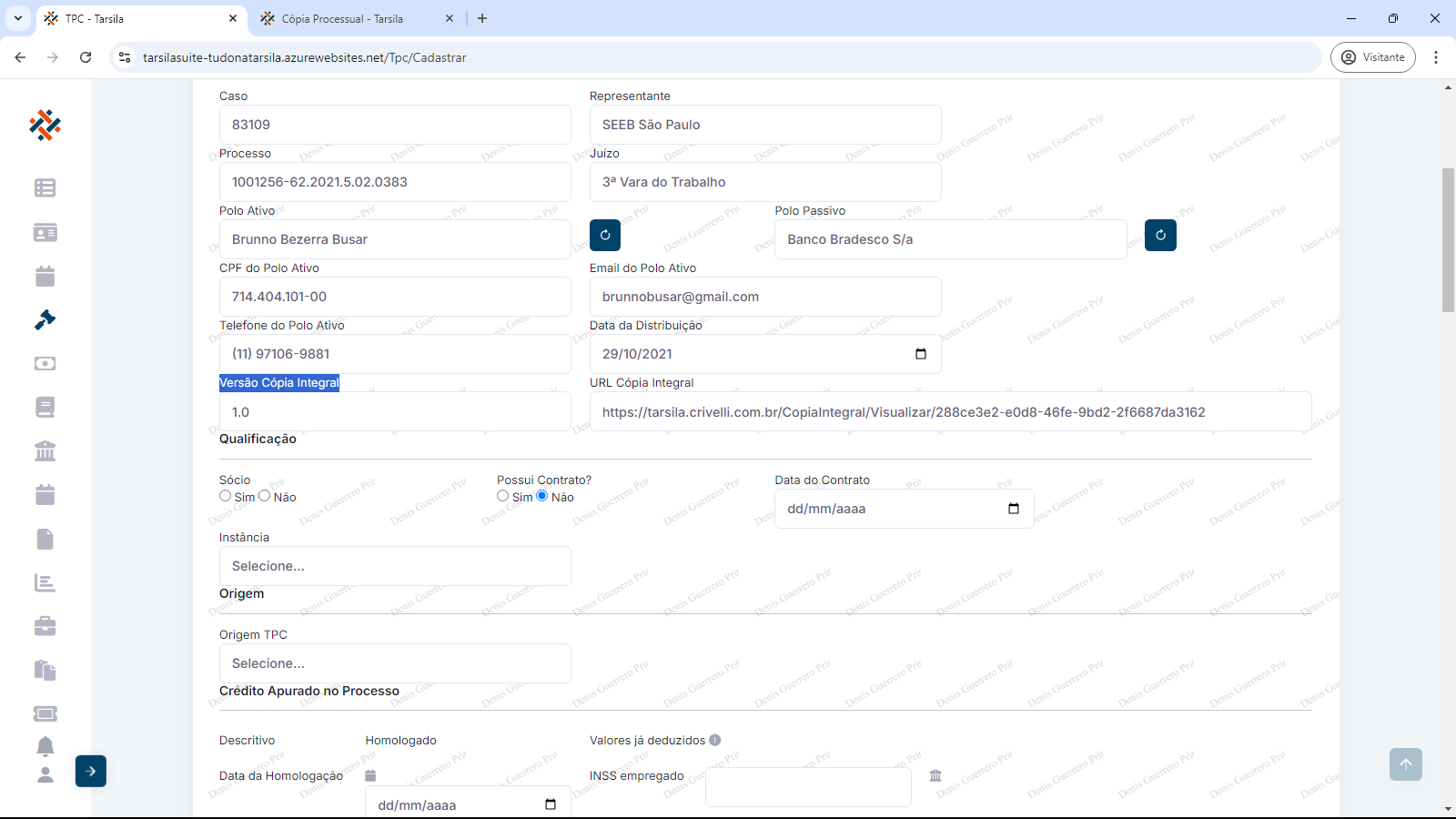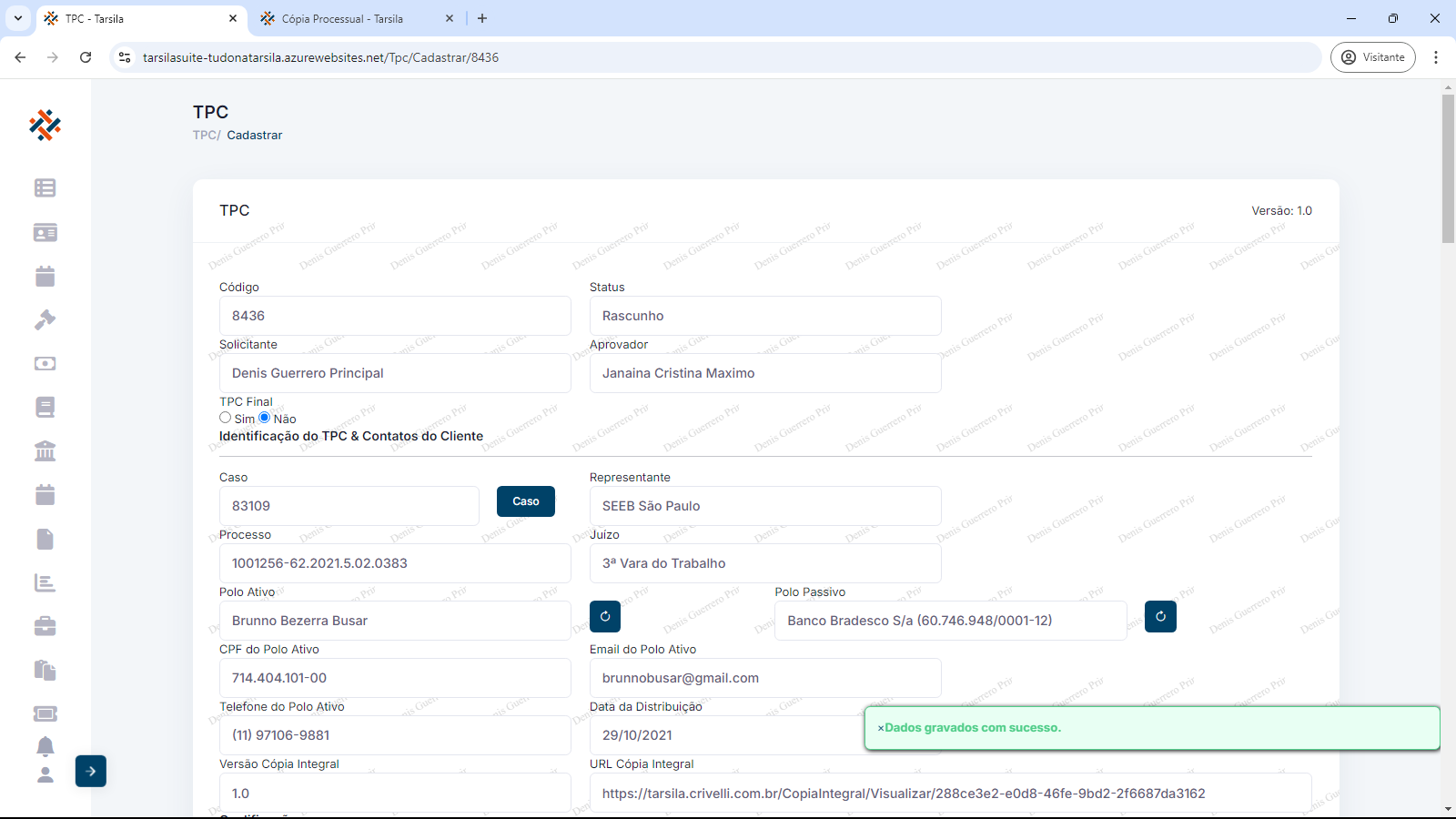 Em Versão Cópia Integral e URL Cópia Integral, são exibidas as informações da cópia de processo.