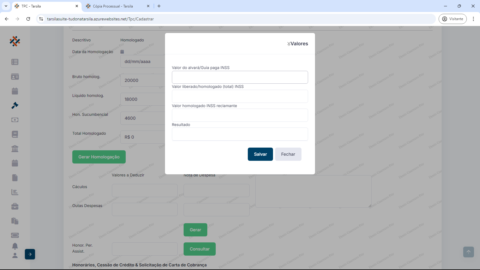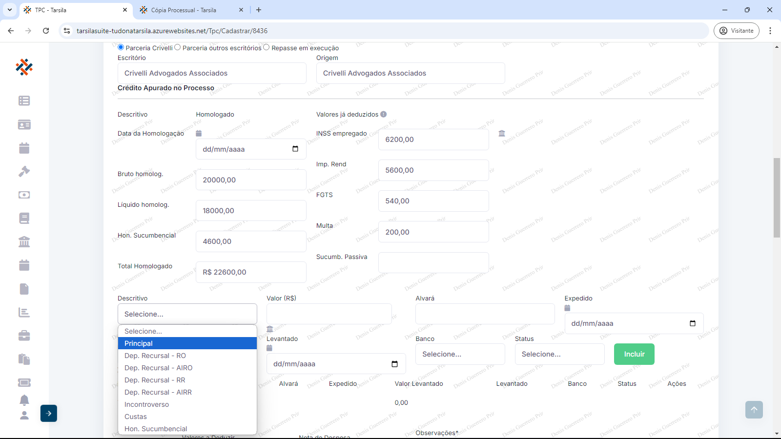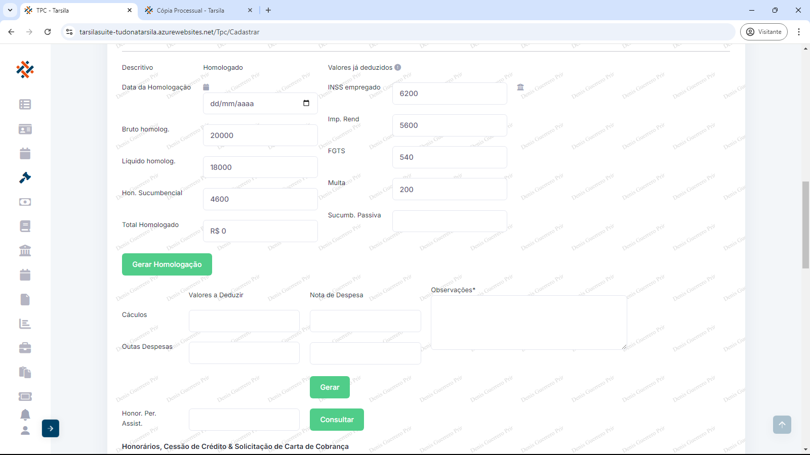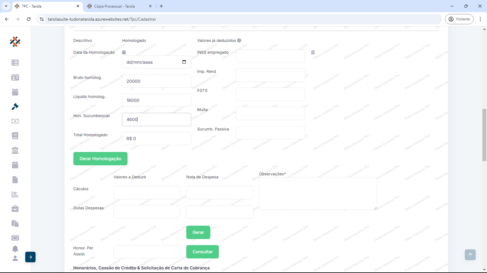 Crédito apurado no processo: os campos obrigatórios “Data da Homologação” ( preencher com data ou usar calendário), “Bruto homologado” (preencher com valor em reais sem o “R$”), ”Líquido homologado” (preencher com valor em reais sem o “R$”) e “Hon. Sucumbencial” (preencher com valor em reais sem o “R$”).