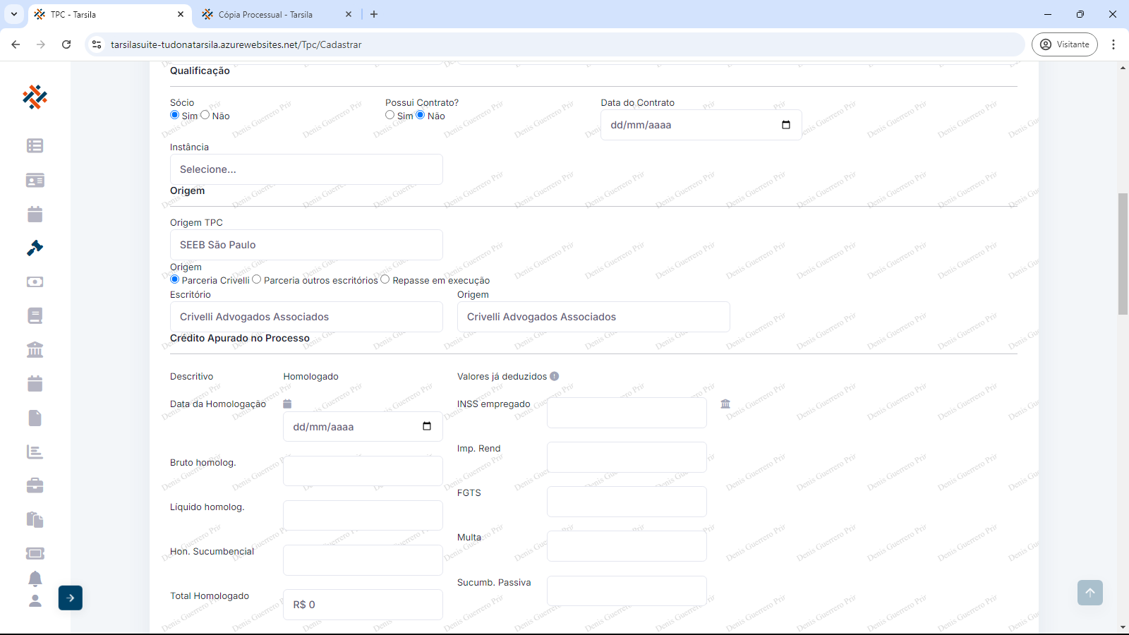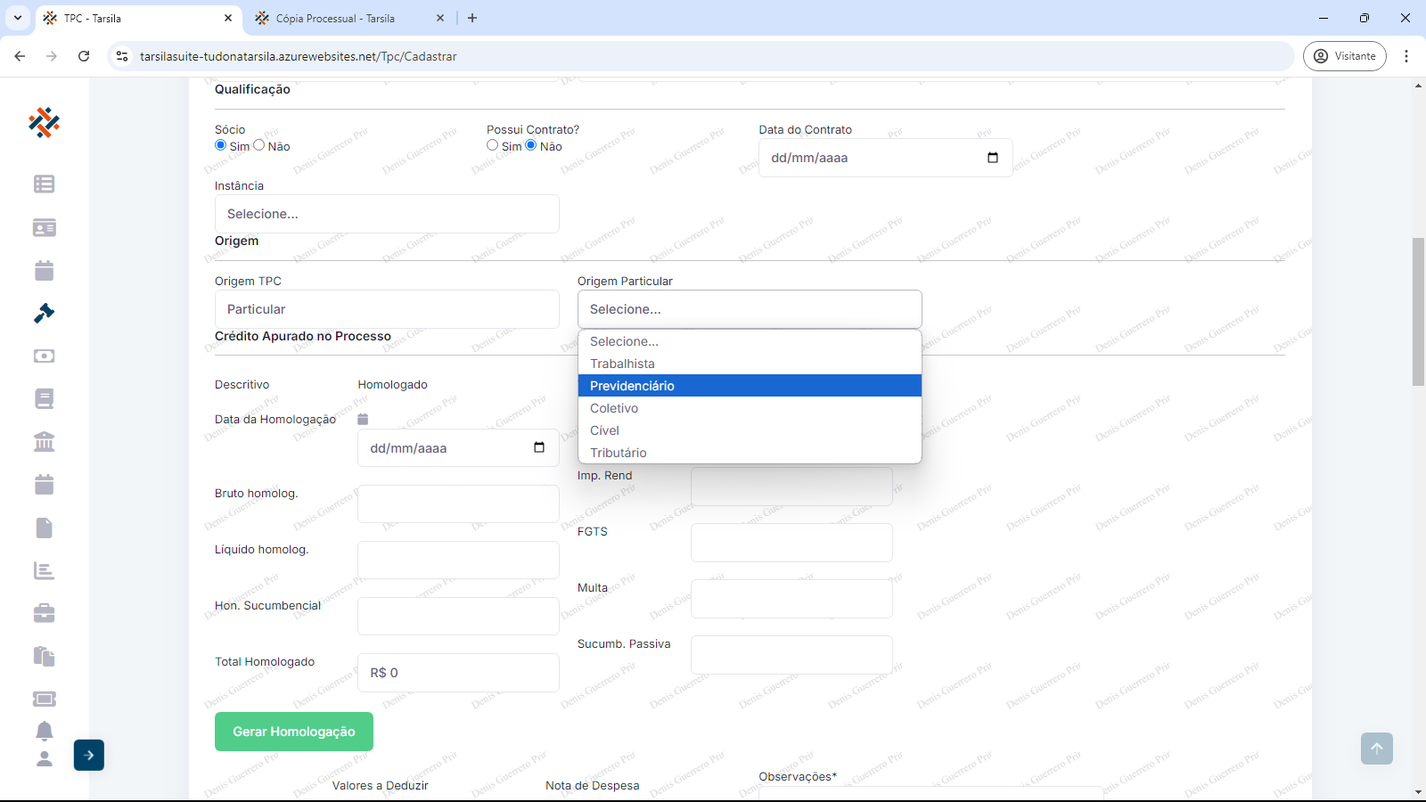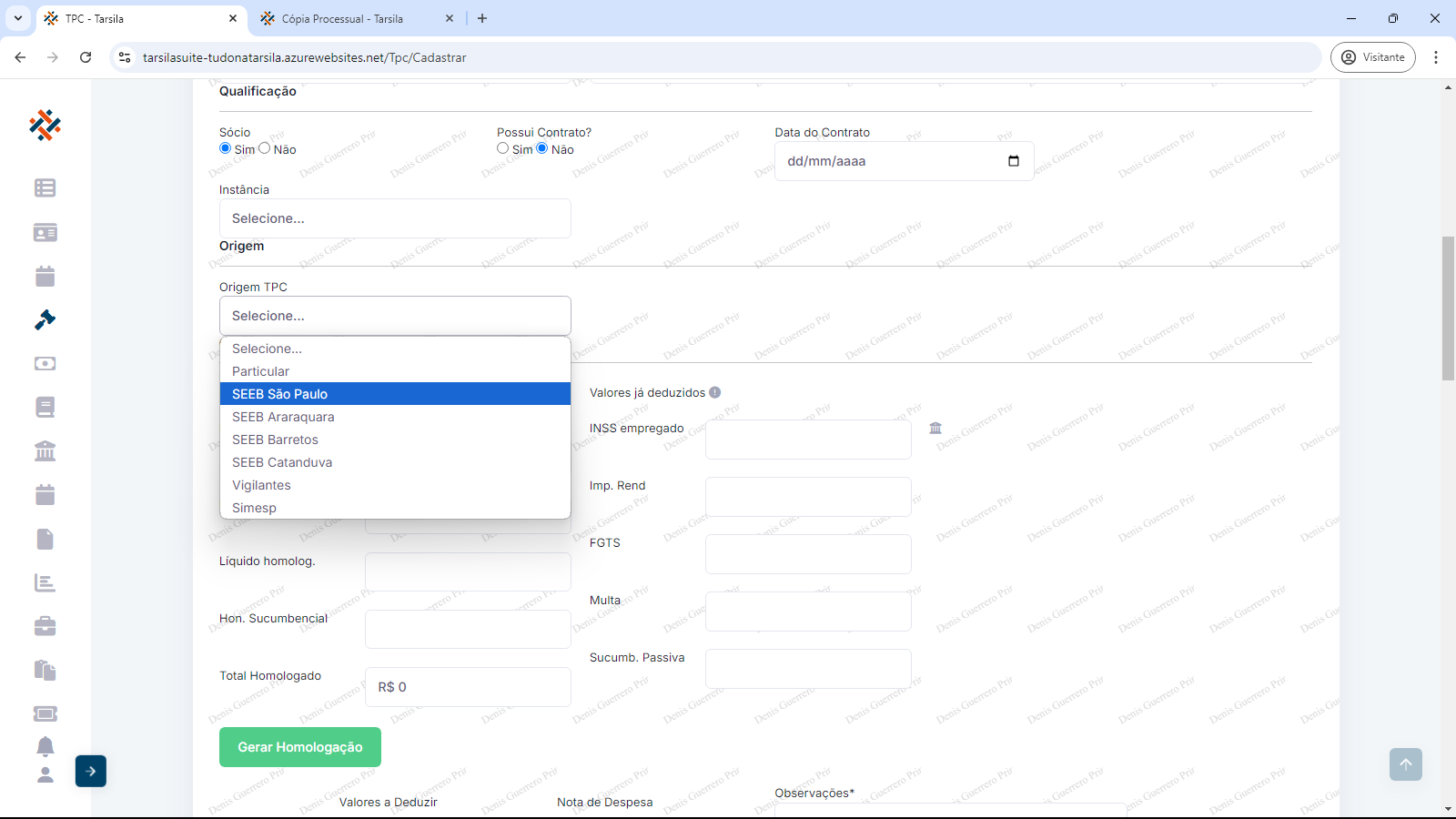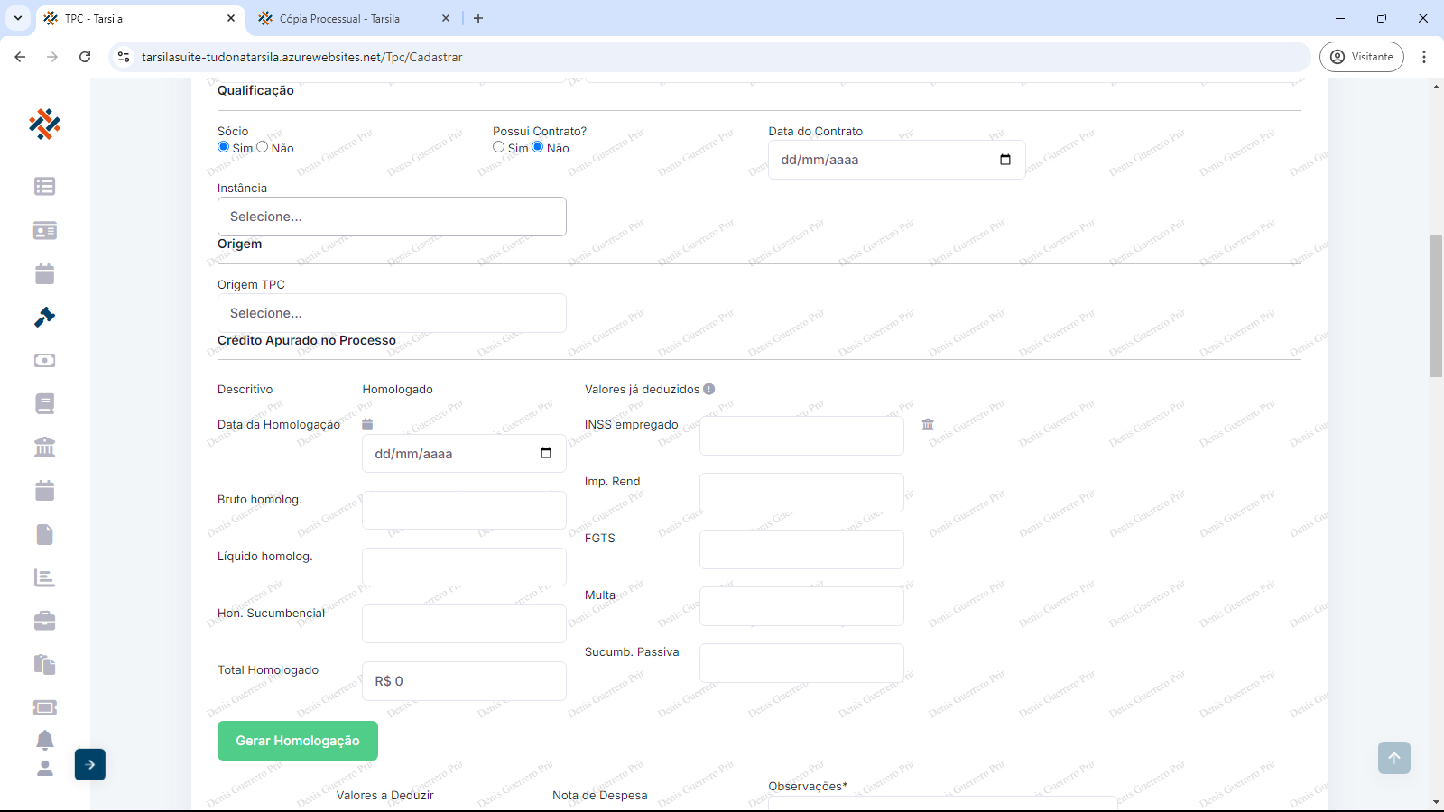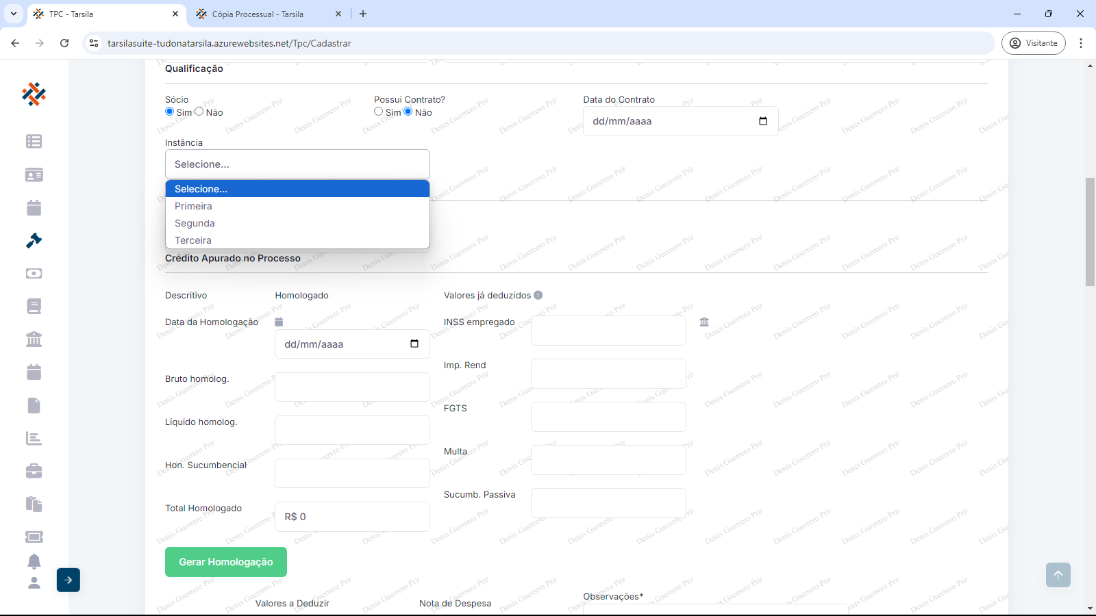 Crédito apurado no processo: os campos obrigatórios “Data da Homologação” ( preencher com data ou usar calendário), “Bruto homologado” (preencher com valor em reais sem o “R$”), ”Líquido homologado” (preencher com valor em reais sem o “R$”) e “Hon. Sucumbencial” (preencher com valor em reais sem o “R$”).
