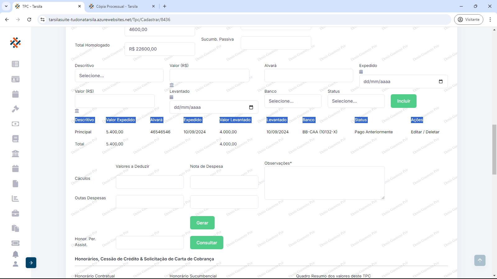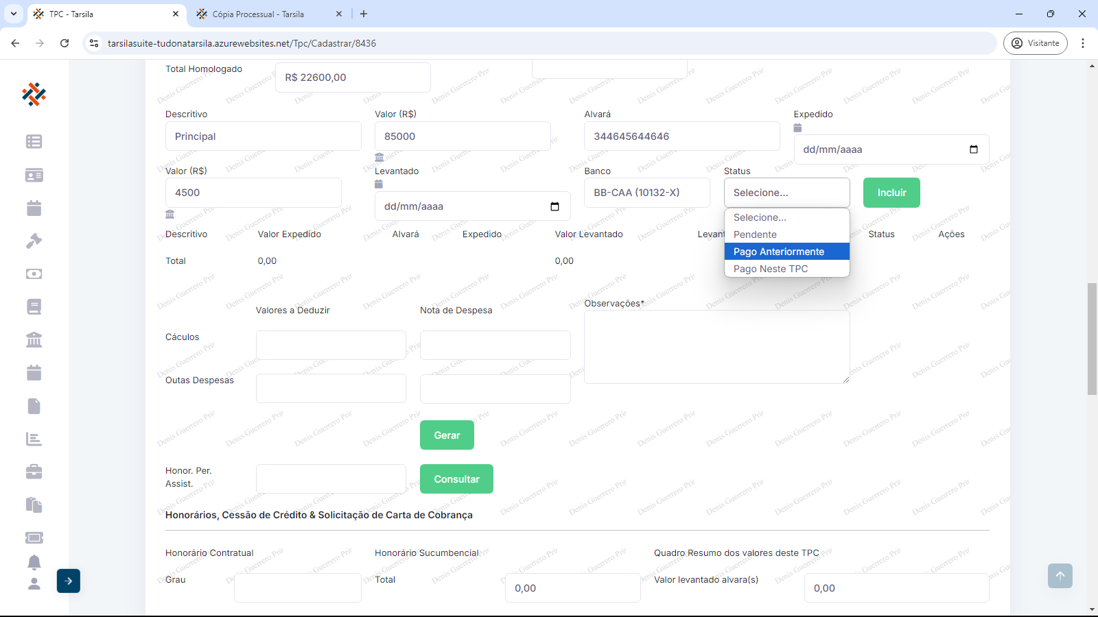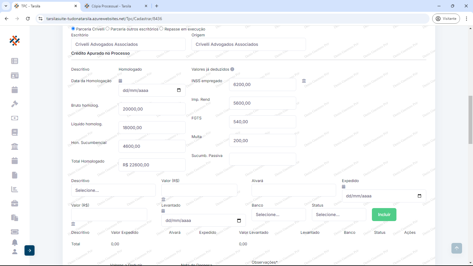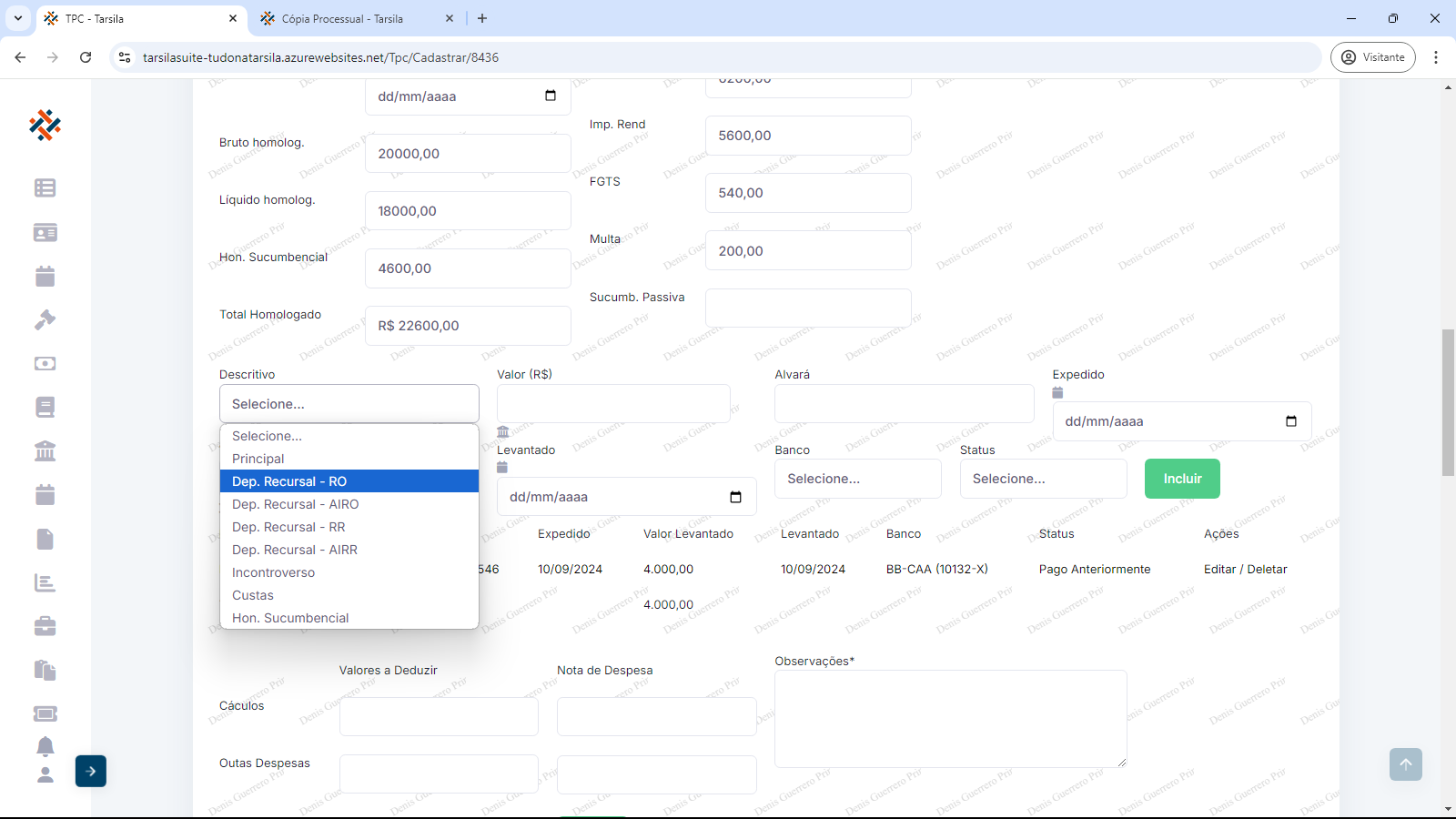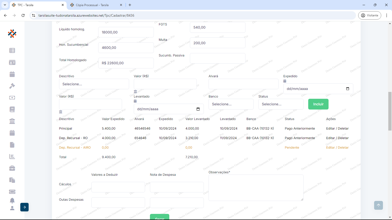 Deve-se informar “Valor (R$)” referente ao descritivo, “Alvará” (Se alvará, informar seu número, se acordo, informar “Acordo”), “Expedido” (informar data), “Valor (R$)” (valor levantado), “Levantado” (informar data), “Banco” (selecionar opção) e “Status” (selecionar opção).