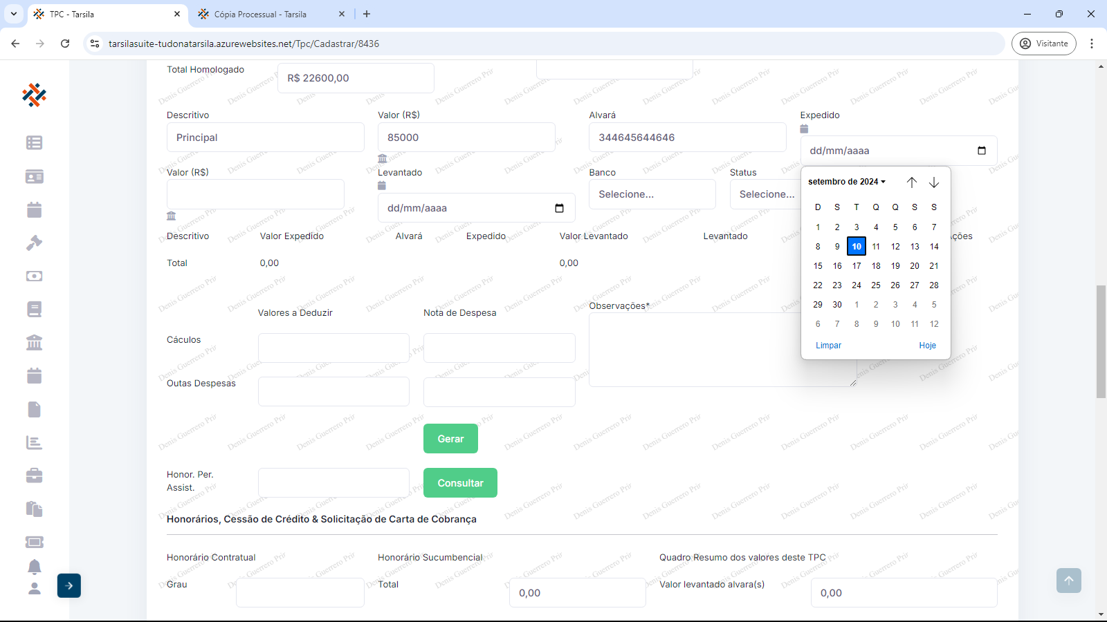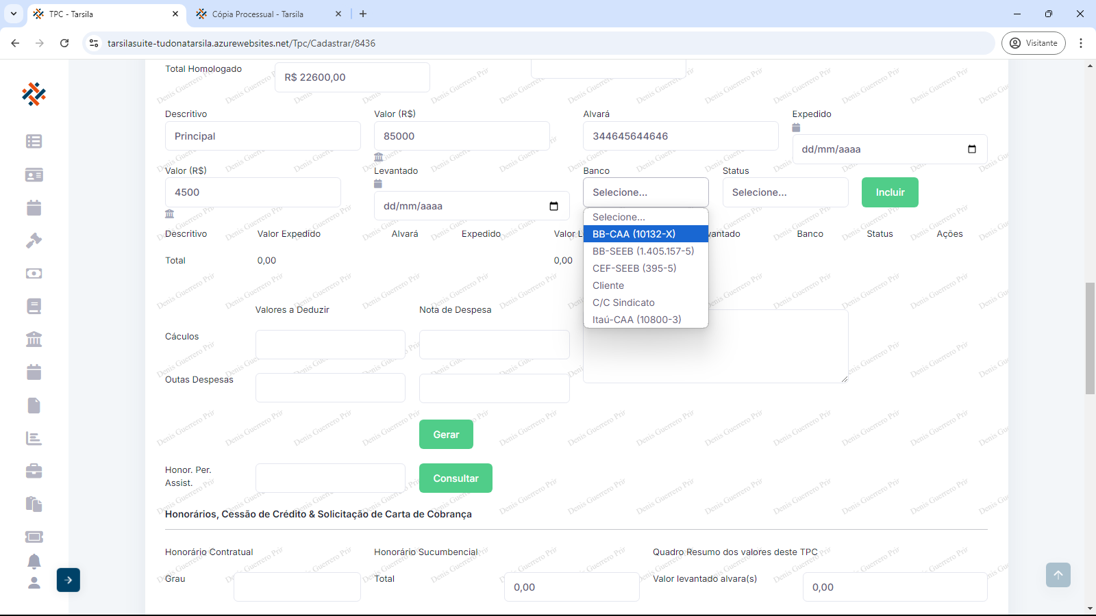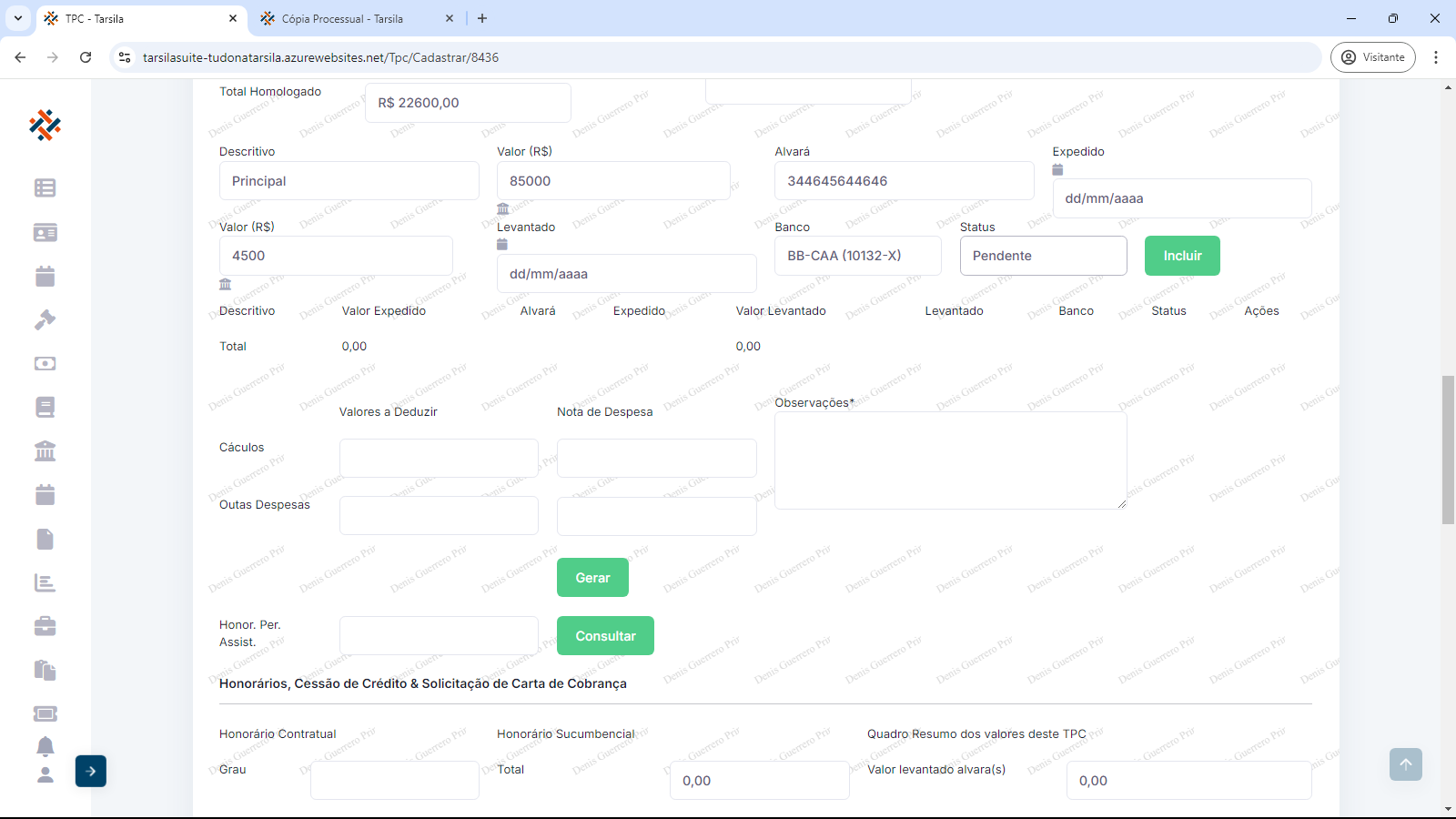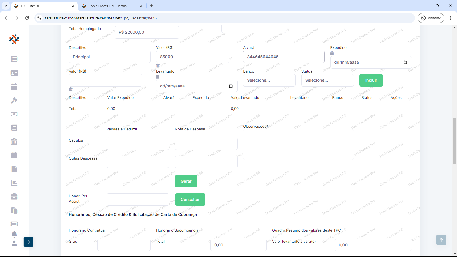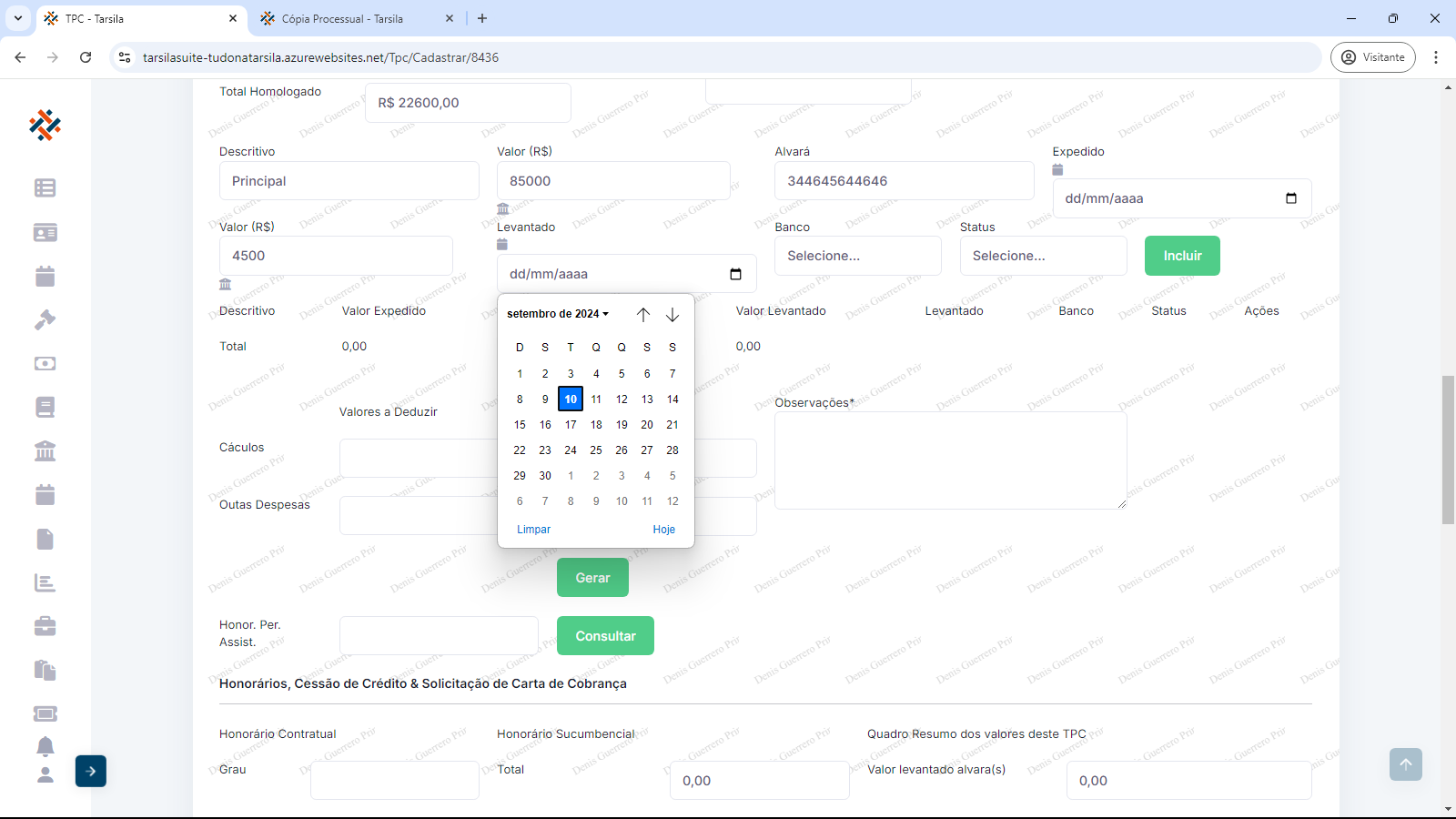 Deve-se informar “Valor (R$)” referente ao descritivo, “Alvará” (Se alvará, informar seu número, se acordo, informar “Acordo”), “Expedido” (informar data), “Valor (R$)” (valor levantado), “Levantado” (informar data), “Banco” (selecionar opção) e “Status” (selecionar opção).
