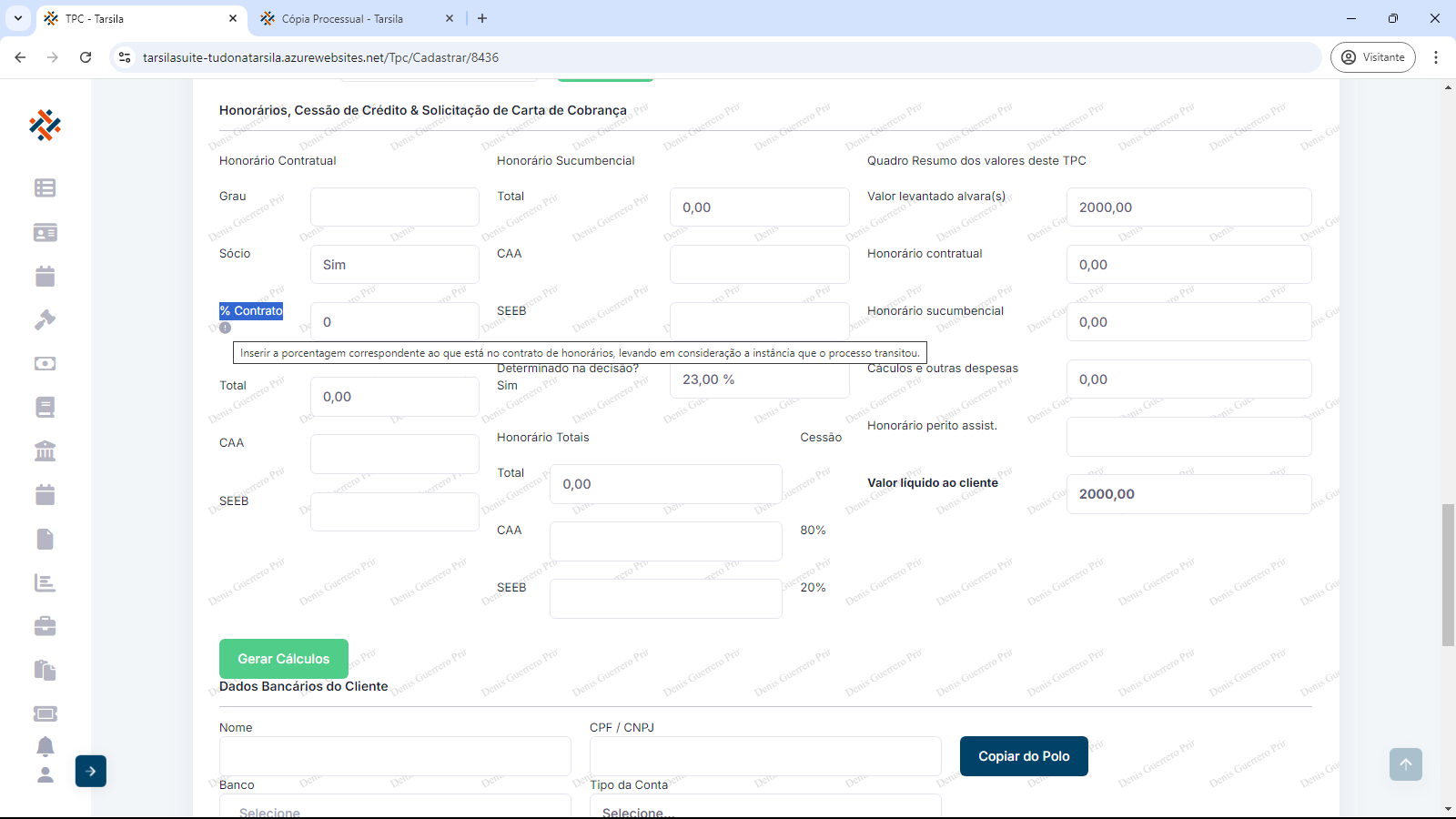 Honorários, Cessão de Crédito & Solicitação de Carta de Cobrança : o único campo que deve ser preenchido neste bloco é o de “% Contrato”, com atenção a observação do campo: