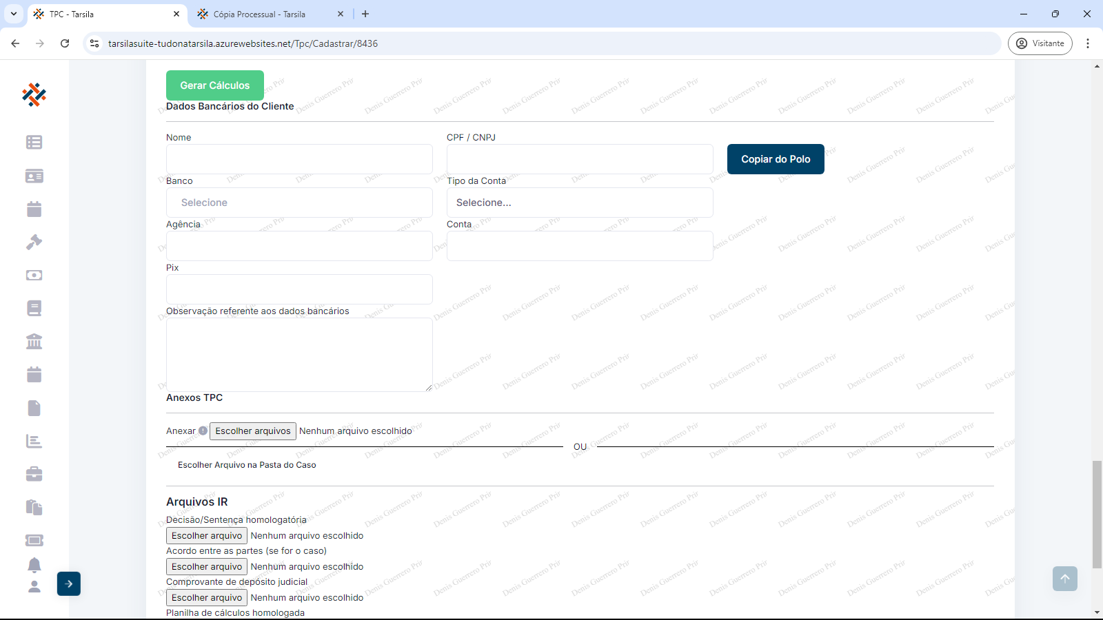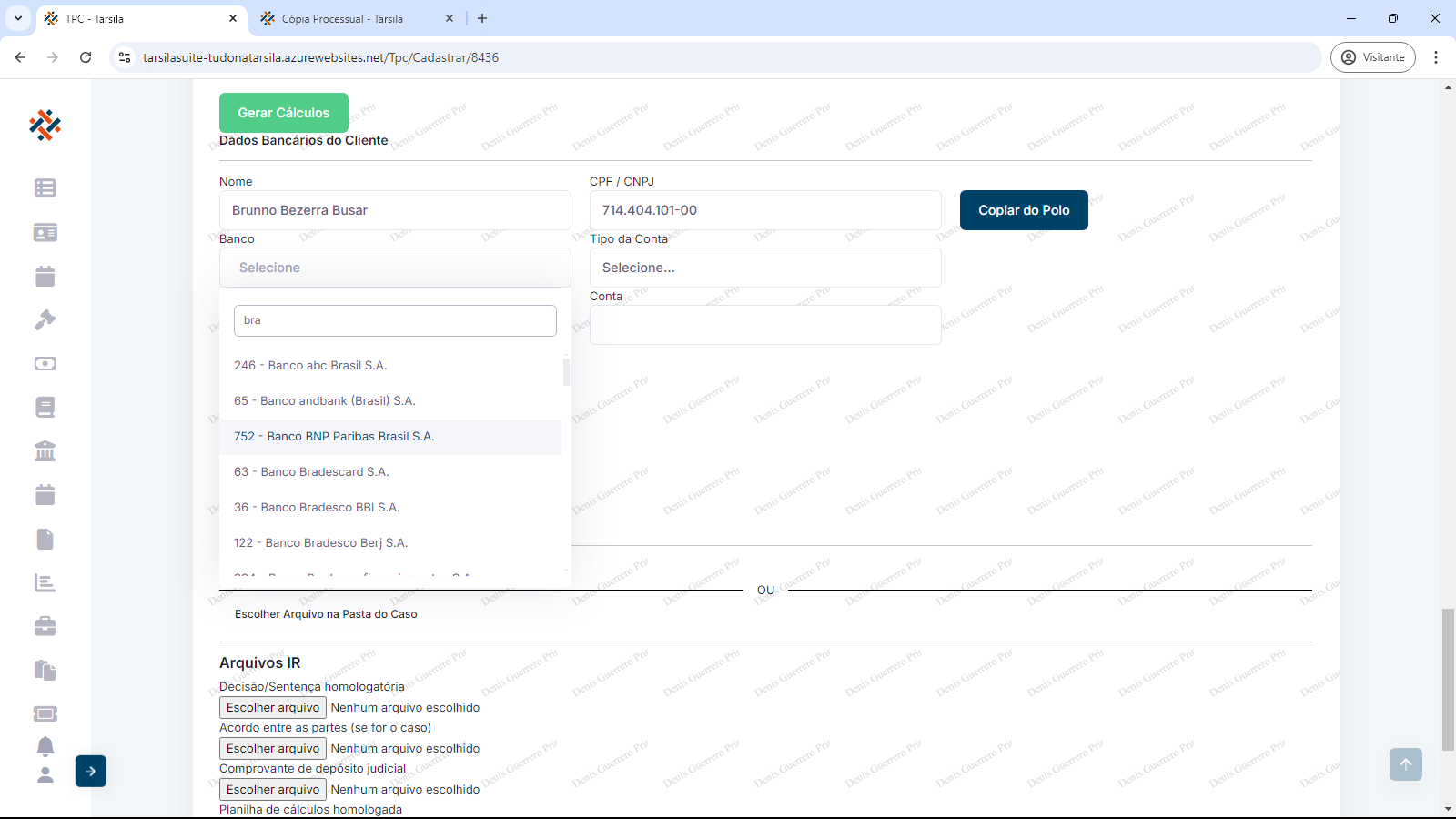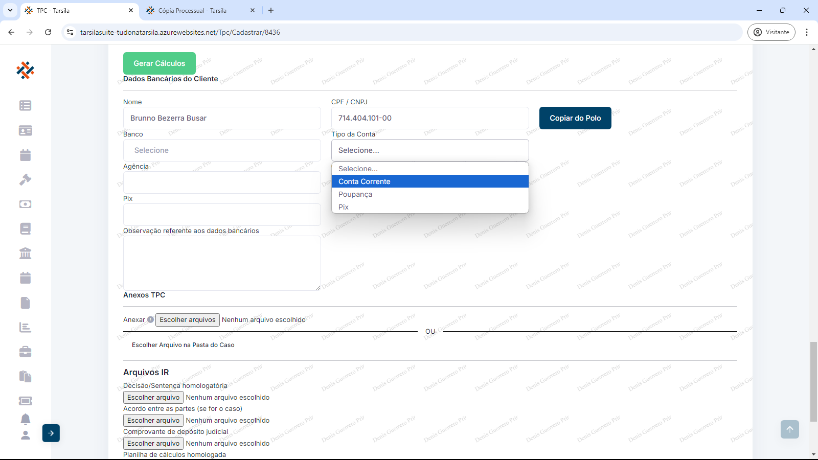 No bloco a seguir, em “Dados Bancários do Cliente”, pode-se importar os dados de Nome e CPF/CNPJ para agilizar o preenchimento, clicando-se em “Copiar do polo”.