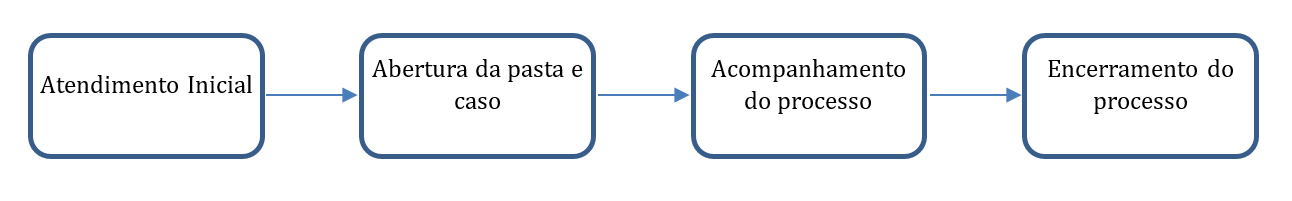 Abertura de pasta e caso: se registra as informações do cliente na ficha de atendimento (pasta) e será gerado no sistema um número de caso (sendo assim denominado mesmo na situação de operações semelhantes, a exemplo CCV) para tratar a necessidade do cliente, gerando um contrato específico e iniciando-se as operações jurídicas requisitadas pelo cliente.