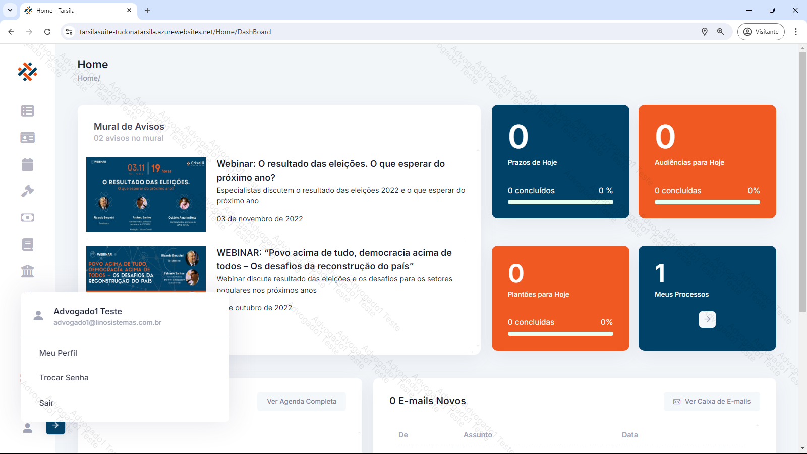 O usuário logado pode atualizar suas informações de Nome/e-mail/celular através desta tela, nas opções do menu inferior esquerda - aberto ao clicar no ícone de usuário, e depois em “Meu perfil”.