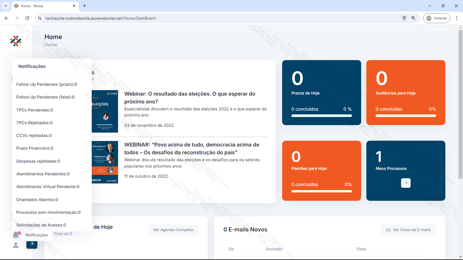 As Notificações (ícone “Sininho”) indicam avisos ou possíveis pendencias relacionadas ao usuário logado (o número em vermelho no ícone representa a quantidade total de novos de avisos). Ao clicar no ícone, é exibida a lista de notificações e a quantidade de cada item. Clicando-se nos itens, é direcionado para a área correspondente.
