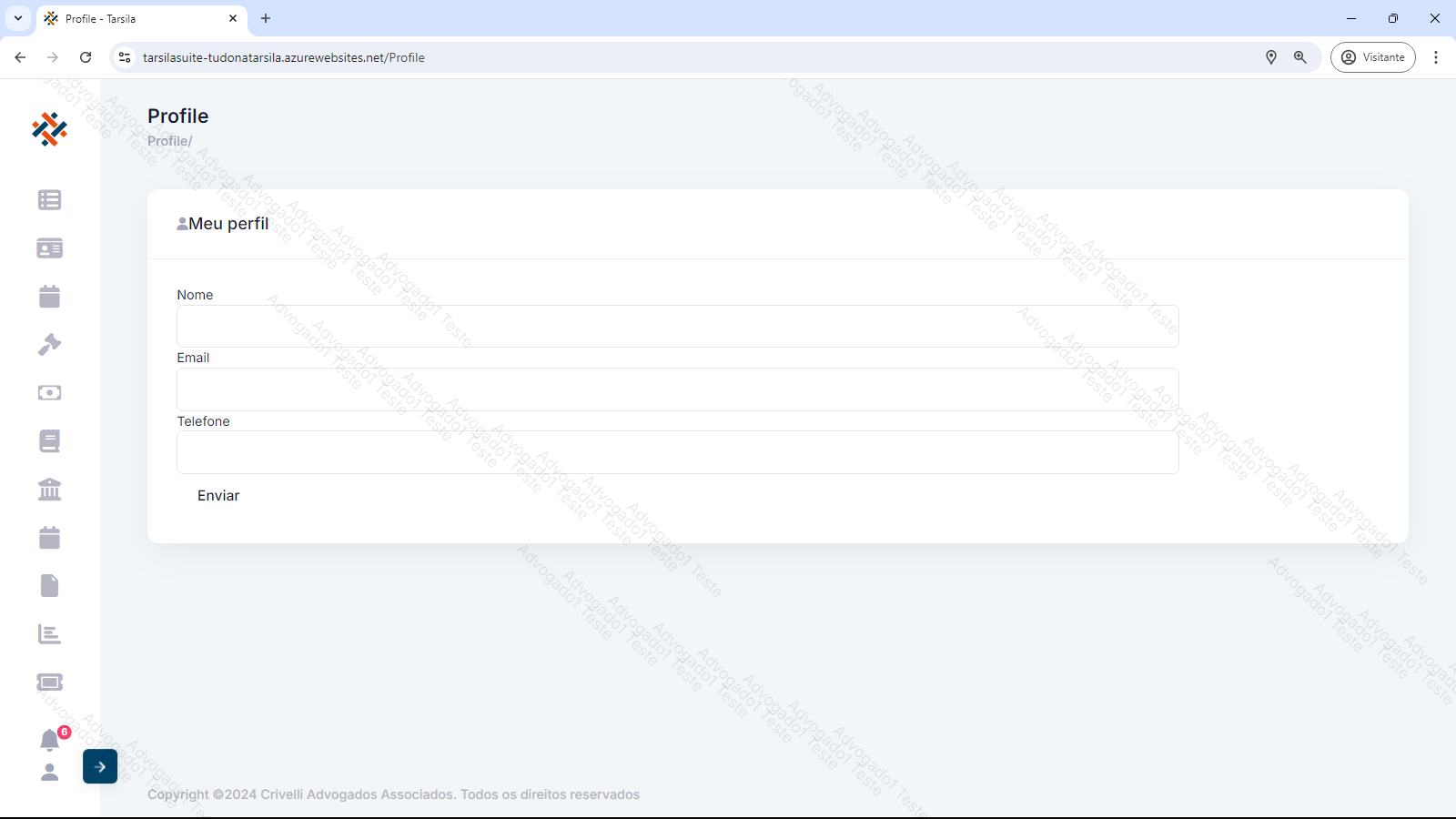 O usuário logado pode atualizar suas informações de Nome/e-mail/celular através desta tela, nas opções do menu inferior esquerda - aberto ao clicar no ícone de usuário, e depois em “Meu perfil”.