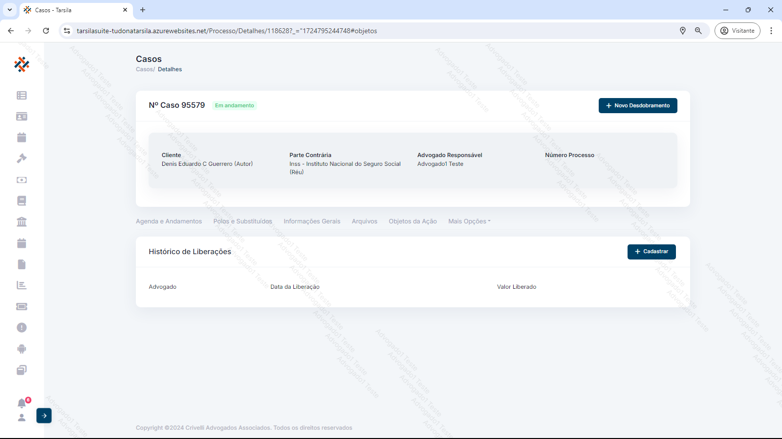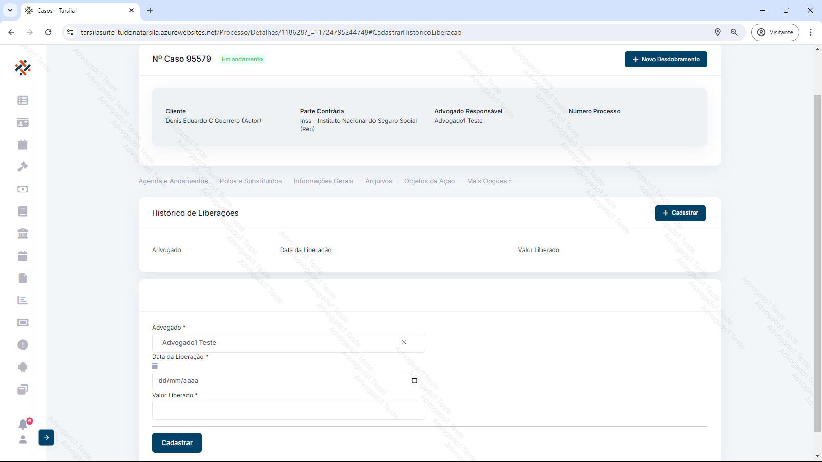 Para adicionar uma nova Liberação de valor, clique em “+Cadastrar”. Será solicitado o Advogado responsável, a data de liberação e o valor atualizado.