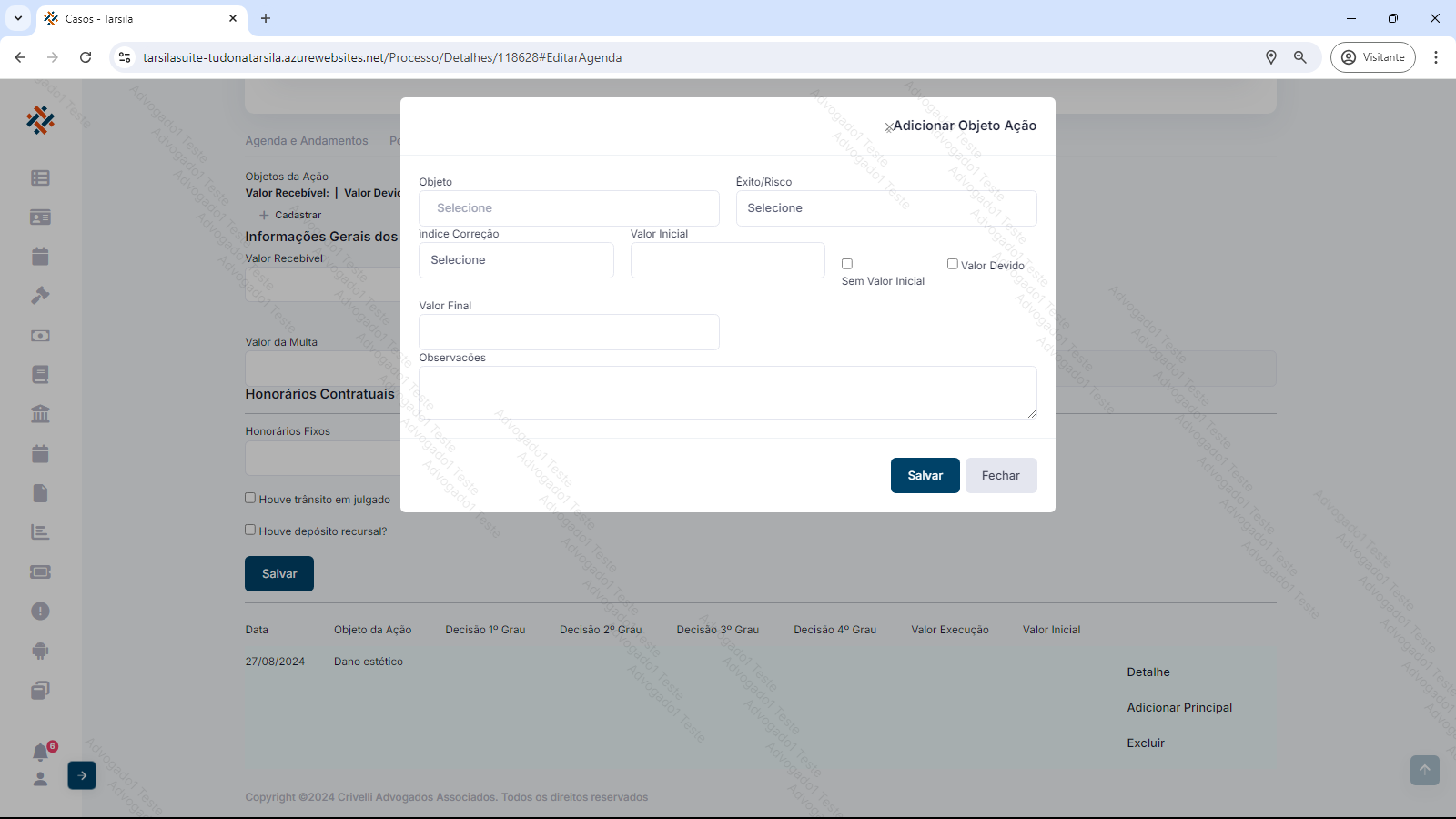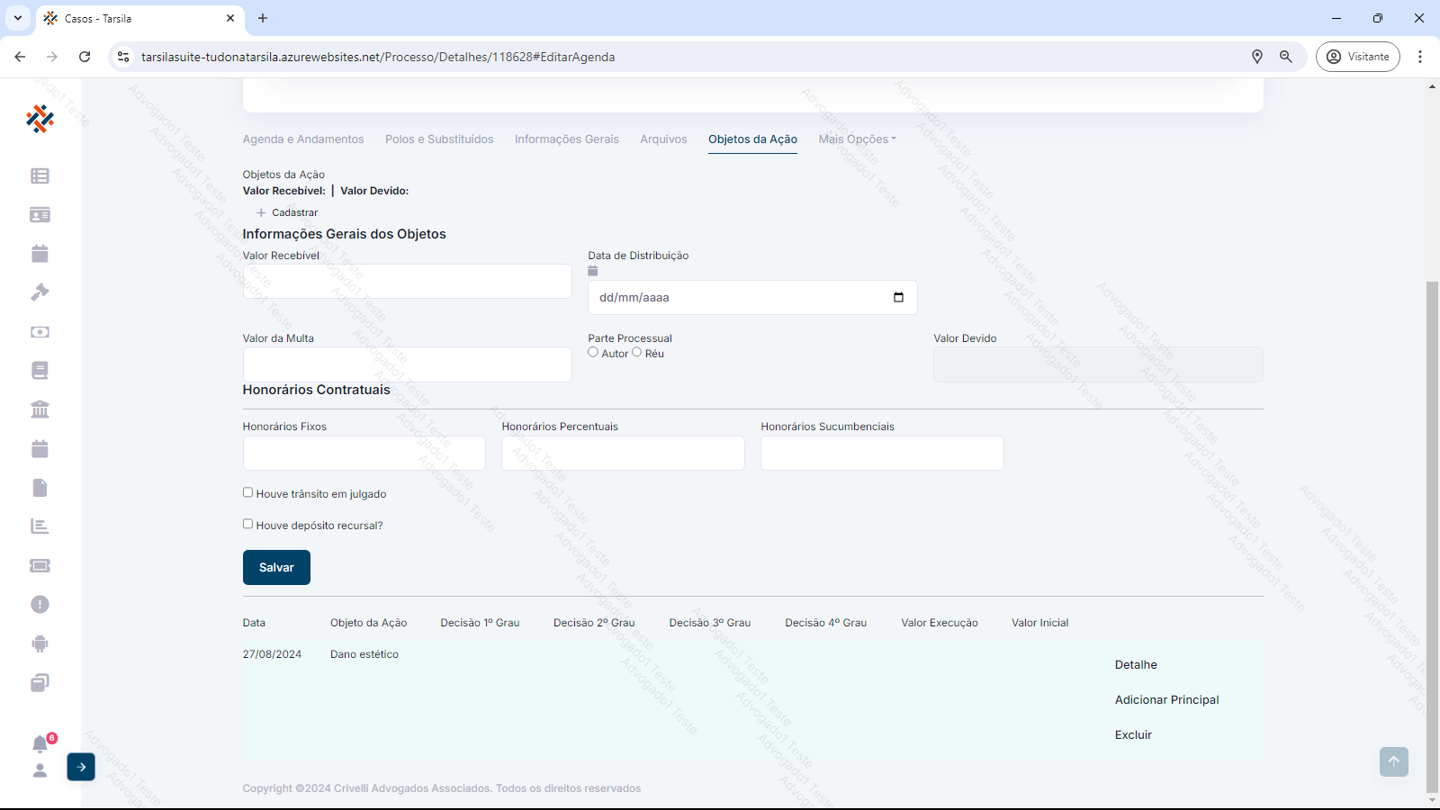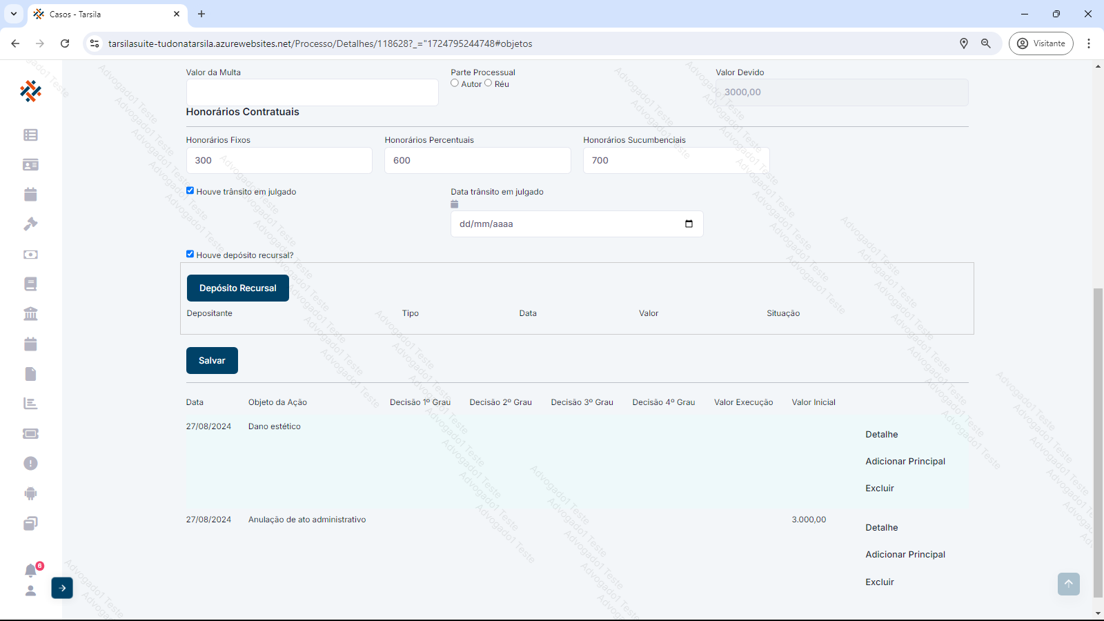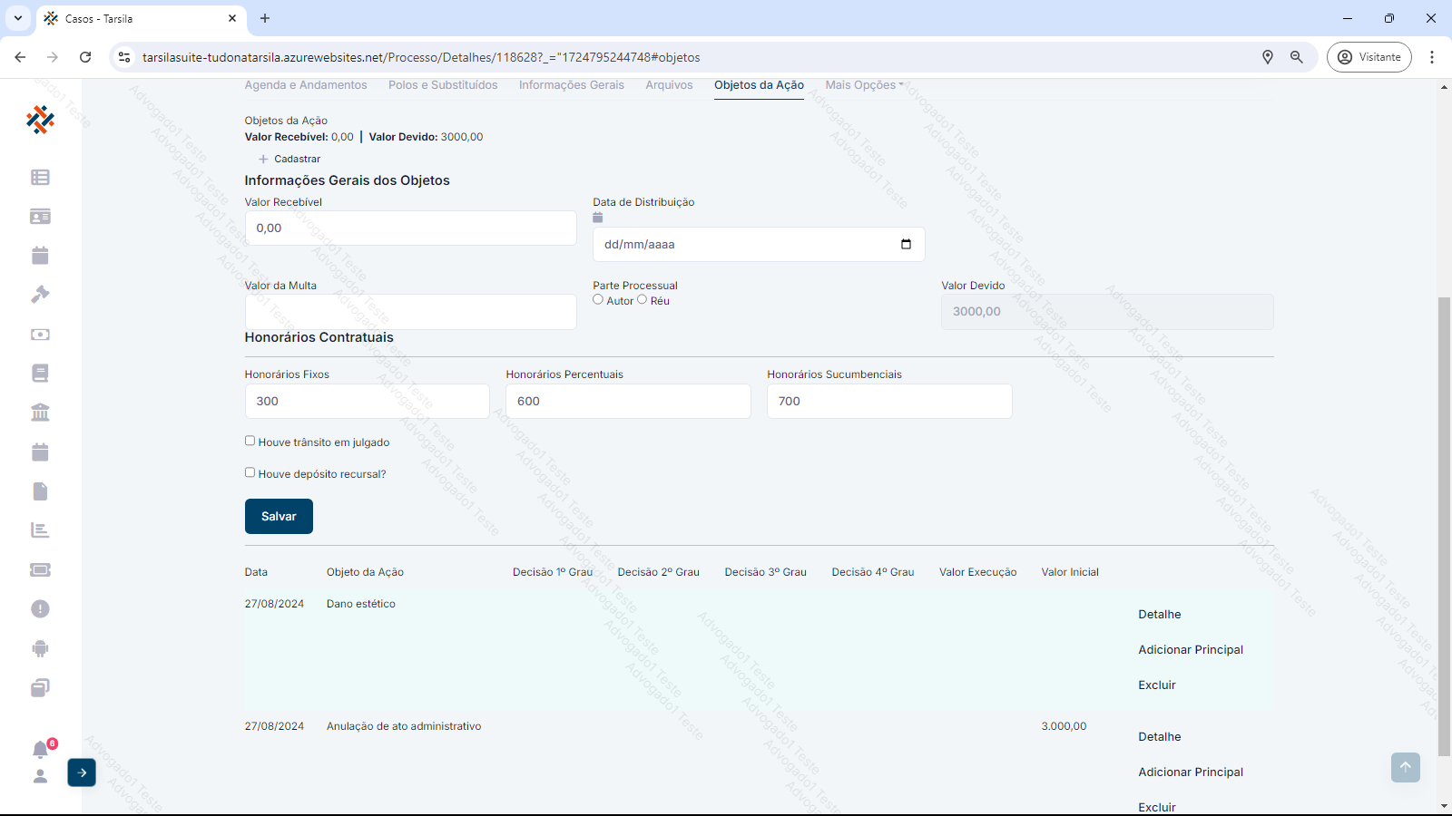 Esta aba exibe o próprio objeto da ação do processo/CCV e sua progressão através das instâncias. Exibe também os valores providos e improvidos de cada etapa.