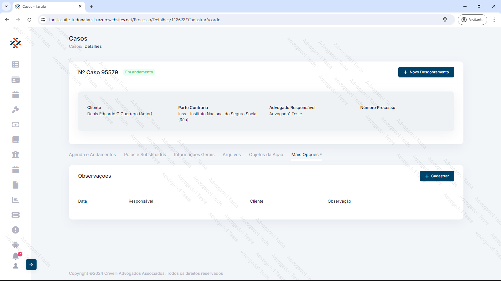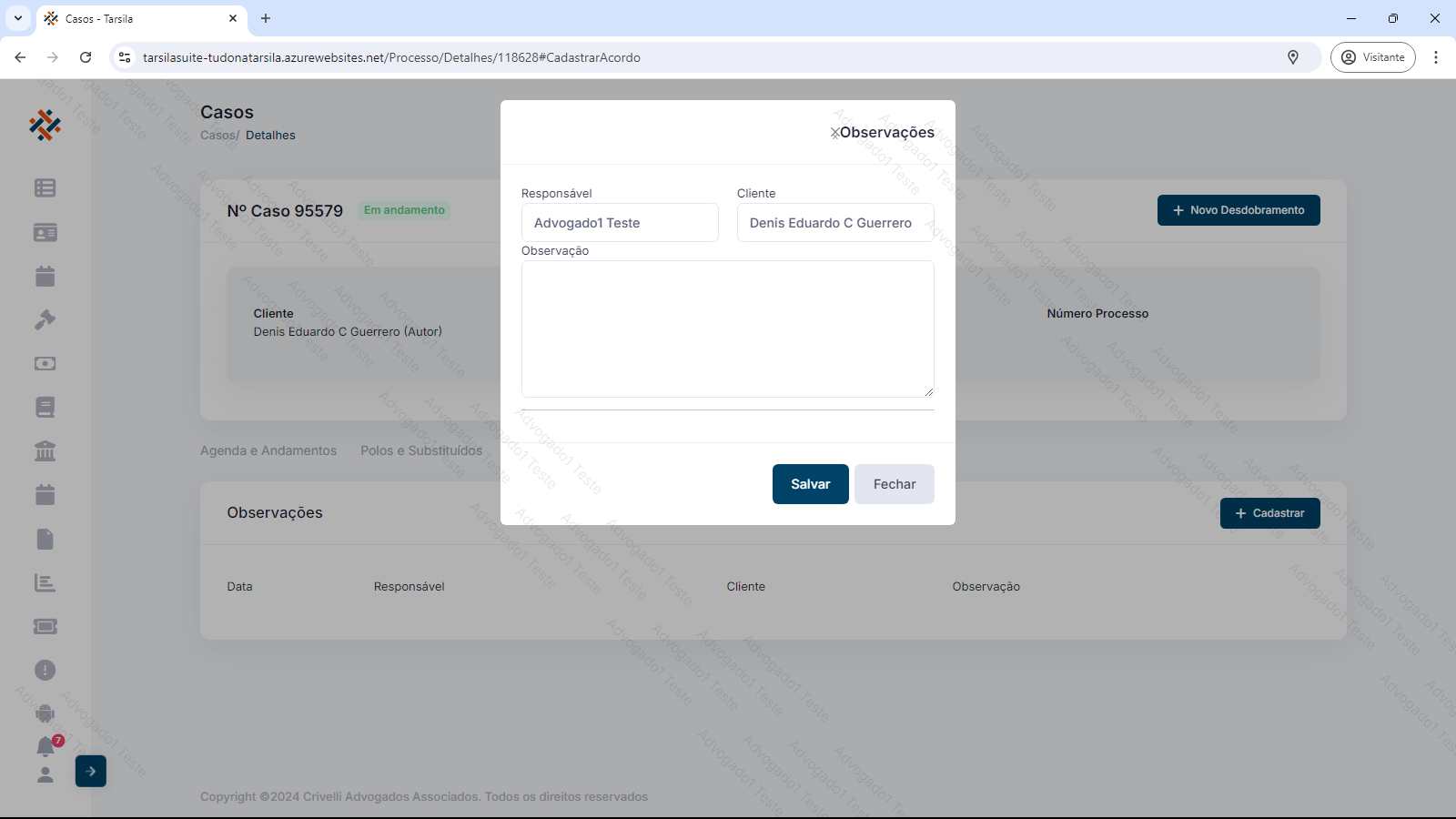 Clica-se em “+Cadastrar” para abrir a janela de conteúdo para digitação de texto. Após isso, “Salvar” registra a observação.