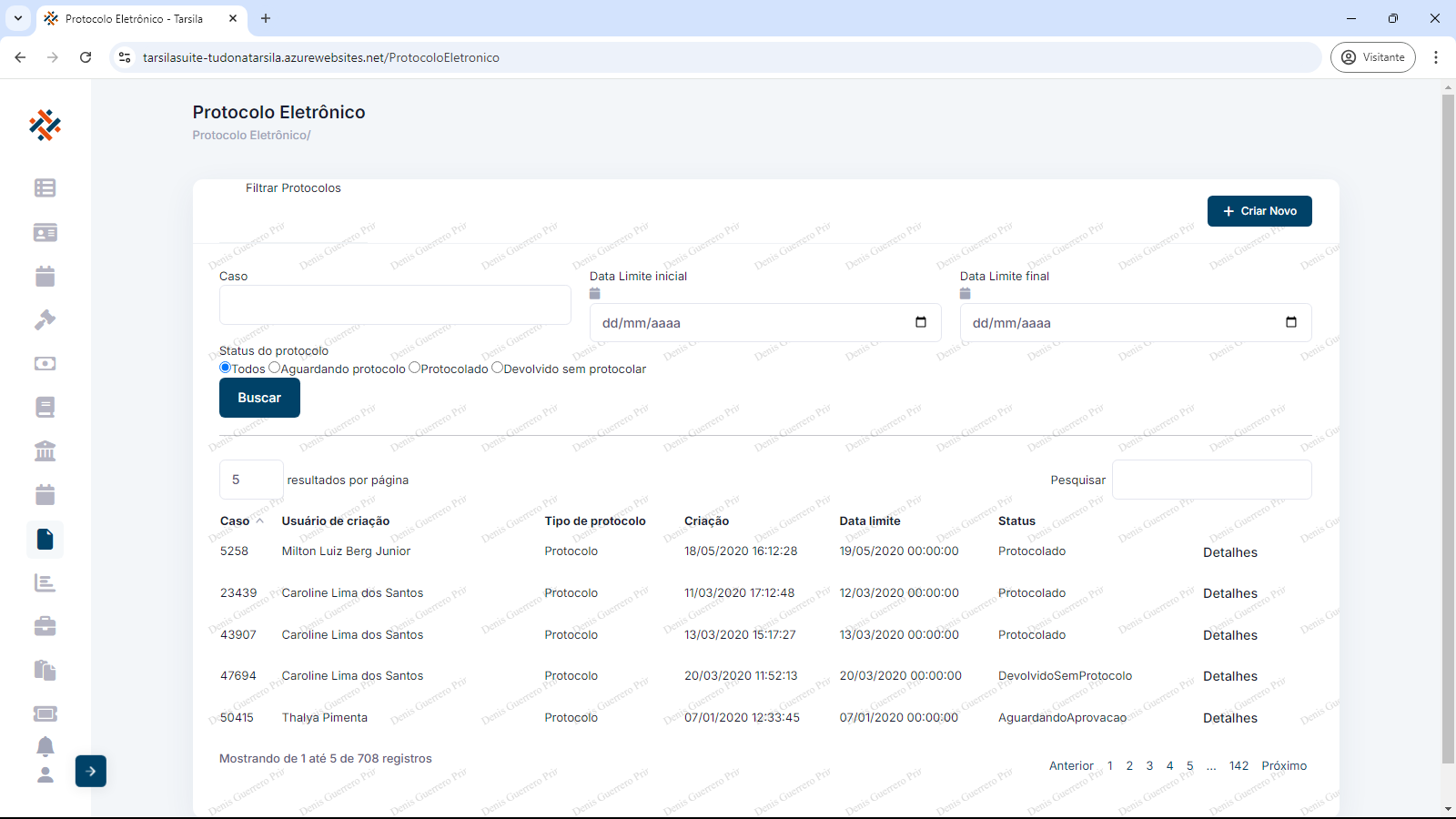 Para efetuar um cadastro de protocolo, clique em “Criar Novo”.