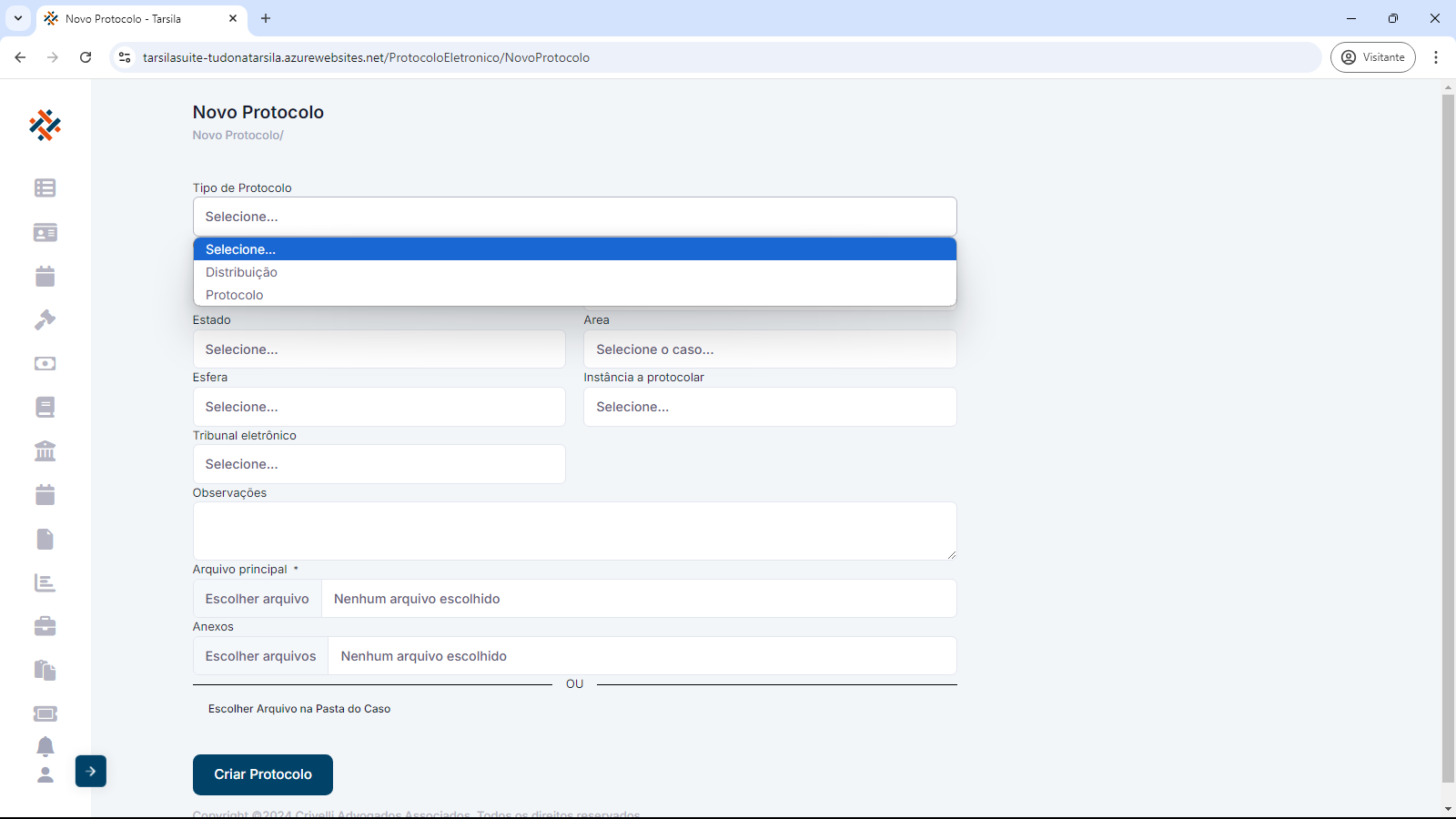 Será aberta a tela para o preenchimento dos dados. Primeiramente selecione o tipo de protocolo.