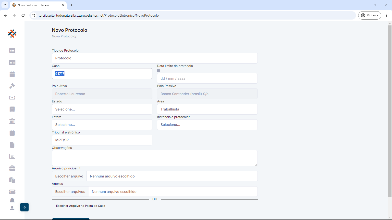 Ditando-se o número do caso e pressionado TAB (ou clicando no próximo campo), serão preenchidos automaticamente os dados relacionados ao caso, necessitando apenas das informações auxiliares dos tribunais envolvidos e a data limite do protocolo.