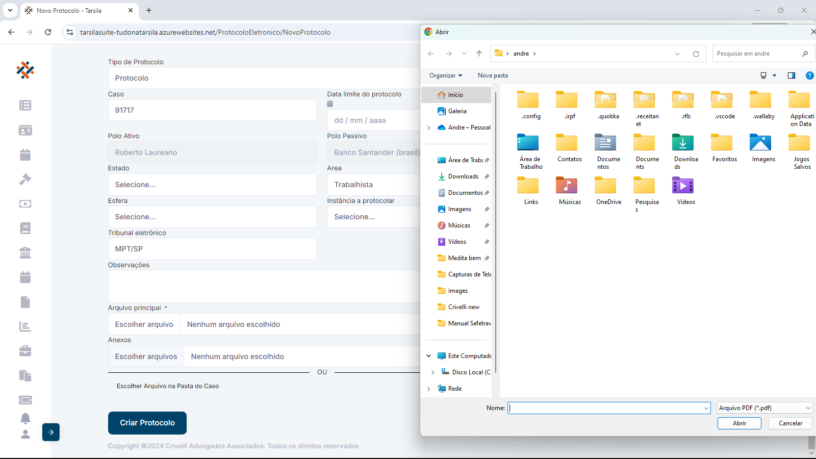 Nas linhas de Arquivo Principal e Anexo, estão os botões “Escolher arquivos” para a anexação dos arquivos. Selecione a pasta e o arquivo desejado e clique no botão “Abrir”. Ao Final clique em “Criar Protocolo”